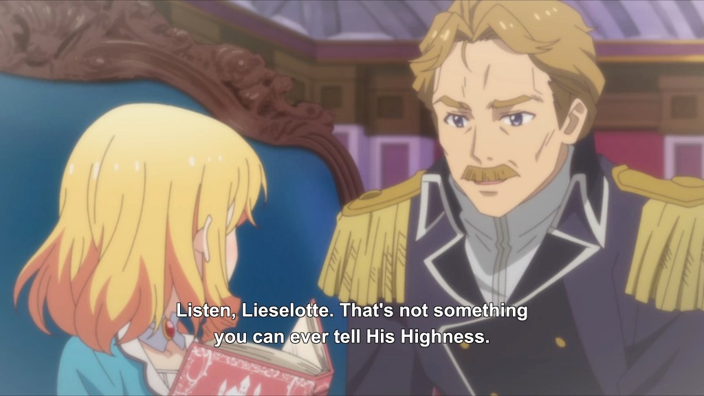 Liese’s father may have meant well—he may have meant to protect his daughter from disappointment. Or he may have been considering how best to prepare her to serve her family’s interests competently through what was essentially a political marriage, which is something her younger sisters would later prove savvy to. Regardless of the intent, the effect was devastating for Liese. She obeyed her father’s words and sought to hide her feelings under a veneer of haughty dislike, rejecting Sieg’s cheery gestures of affection. But it hurts her every time. And her love for him did not wane; it only grew more with the passing years, as did the pain. But Liese did not want to be a burden to Sieg, so she lied to him in word and deed, her tsundere ways serving as a coping mechanism.