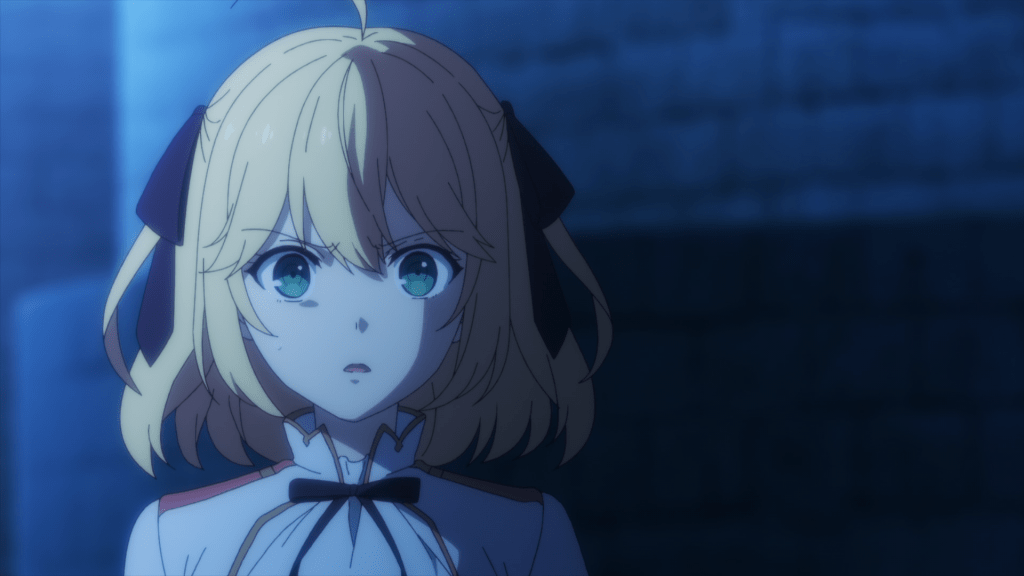Of course, these sweet words are ultimately empty. Remember that composition from episode three, where Euphie was consistently isolated from other characters in the shot? That comes back here, betraying an insidious tone to Algard’s dealings with Lainie—not to mention the murky lighting and crooked framing throughout the scene. (And the fact that he’s been manipulating things behind the scenes. But still.)