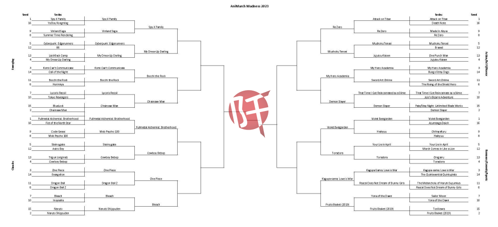 During the last round, one of the number two seeds fell, with Naruto Shippuden losing to Bleach, perhaps strengthened by an excellent new season of the show. The lowest seeds in this round, though, are Bocchi the Rock (11), which defeated fellow first-time entrant, Komi Can’t Communicate, and Re:Zero (8), which pulled out the upset of the tournament. Subaru and company slipped by number one seed and former champion Attack on Titan. Can they carry that momentum forward? Will a new series come out on top? You’ll decide what happens!