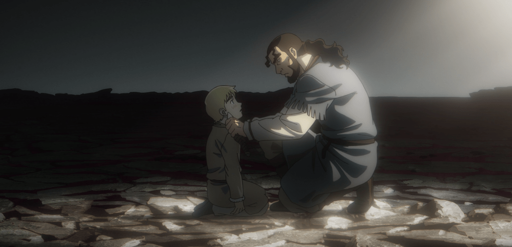 As his enslavement continues, Thorfinn is forced to confront his life both now and in the past. While involved in a fight with his master’s retainers, he is knocked unconscious and has a vision of the afterlife. First, he experiences a kind, gentle dream where he sees his father, Thors, tending the family’s sheep. Though his father died when Thorfinn was young, he remembers Thors as a loving father, one who forsook the violence of war to live a life dedicated to caring for his family and village. He is a symbol of the Good Father and the Good Shepherd. And as such, in Thorfinn’s dream, Thors pushes his son to move forward by confronting his sins.