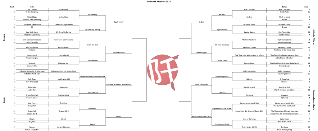 And boy, are these matches today a doozy! Three #1 seeds made it through, including newcomer Spy x Family, while just one number two made it (Demon Slayer). Cinderella stories abound, including Bleach (7), Re:Zero (8), and the biggest surprise of all, Bocchi the Rock (11), which did the improbably and took down Chainsaw Man last round. Even Kaguya-sama is a surprise, having beaten last year’s runner-up, Fruits Basket, and preventing a rematch of the championship with Violet Evergarden this round.