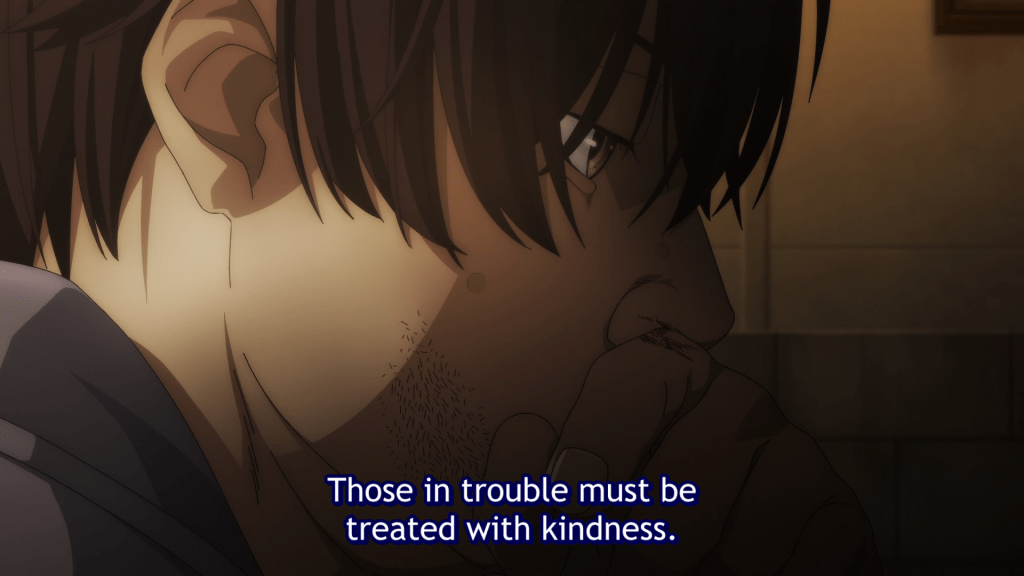 I’ll admit, part way through I was a bit nervous that Mash was just going to be this super strong super dense one-note monotone shonen mc (the door gag stressed me out), but things took a surprising turn for the sentimental, delving into how Pops ended up adopting the abandoned unmarked boy and the bonds of family love that tie the unlikely due together by the heartstrings. I even teared up a smidge, against my better judgment. Don’t get me wrong, this episode was 95% full-on action and gags, but that little dash of human emotion really brought it all together for me, serving as the cherry on top, to use a metaphor that I’m sure Mash would appreciate.
