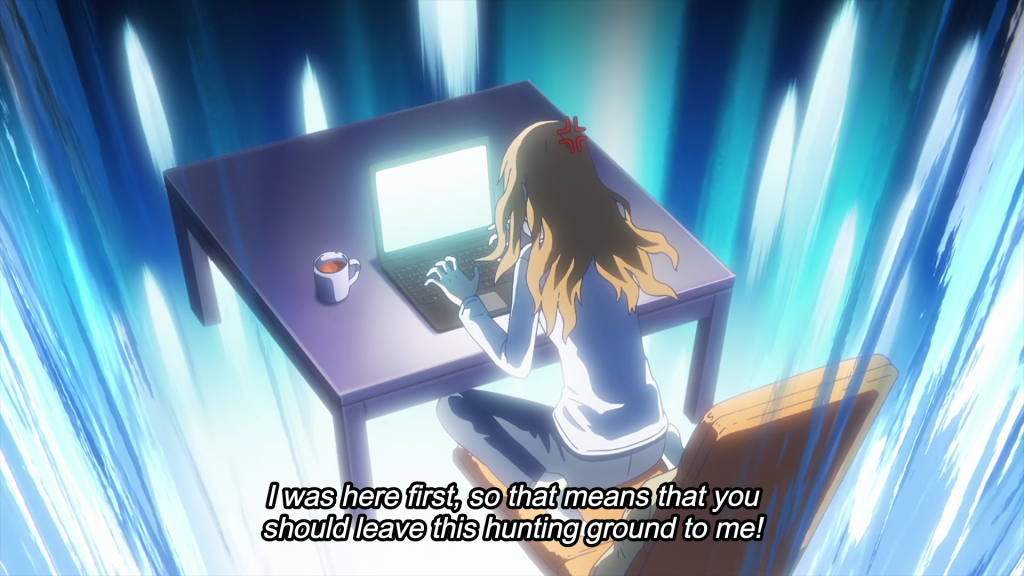 Dun dun dun! *dramatic stinger of dissenting opinion* This reminded me of Recovery of an MMO Junkie, except…less cute or funny. Don’t get me wrong, the episode was mildly entertaining, enough that I’ll give the series at least another episode before I pull the trigger, but I found it underwhelming in light of the praise my colleagues have given it. None of the characters really appealed to me, so all the episode had going for it was some funny moments, and those didn’t always land. Sometimes beats I think were supposed to be funny just left me feeling awkward.