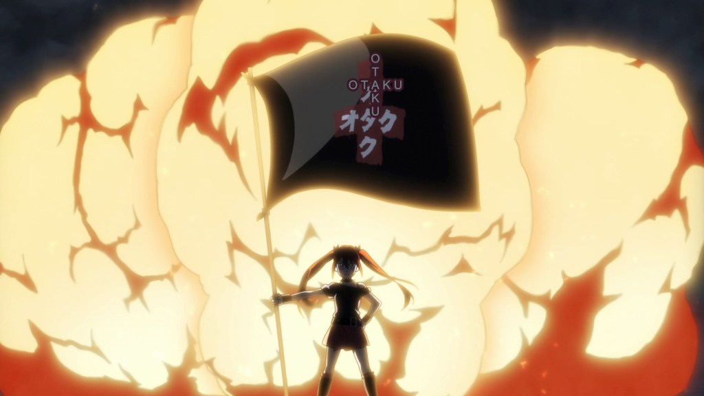 The premise is pretty much the same as Rumble Garanndoll, and the idea of the persecution of otaku is by no means new. But everything else about this episode exudes a kind of crazed creativity—from the rocking soundtrack, to the at times abrasive linework, the snarling dialogue, and the relentless pacing—that promises to keep things interesting, even if not always comprehensible. It’s quite reminiscent of FLCL, but with an adult cast, and like that series, the humor is not always for children, so be warned. It has that same chaotic energy to it too, but ramped up a notch, what with the revolutionary war, internment camp imagery, and exploding cans of Oden noodles and all. It’s certainly not your typical magical girl/mahou shoujo, or even your typical dark mahou shoujo, and it won’t be to everyone’s taste. But for my part, I am ready to buckle in and see where this madness takes us!