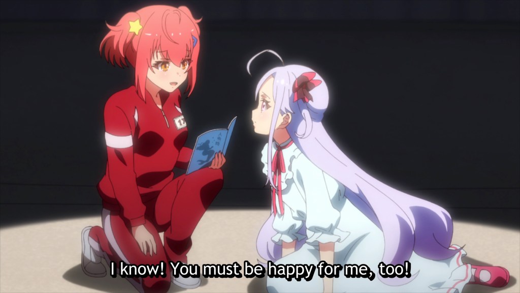 …before you skip past this one as too derivative to bother with, or too short on idol choreographies to excite interest, let me present two things for your consideration: first, there are some wonderful moments of performance here from studio Lerche, initially when Shizuka presents her Romeo, and again with the German girl’s audition. Not only is the voice acting really strong in these moments (and with Kokona’s final performance as well), but the character acting—that is, the animation—is so vivid, almost as if there are more frames per second, with attention to small gestures and micromovements. Reminds me of The Glass Mask and its attention to the craft of acting. Second, and this one is the kicker, the final shot of the episode turns everything—and I mean everything—on its head!!! I don’t want to spoil it, but trust me, give the episode a try, look out for that final shot, and then tell me you’re not intrigued and you didn’t exclaim aloud at your television or computer screen.