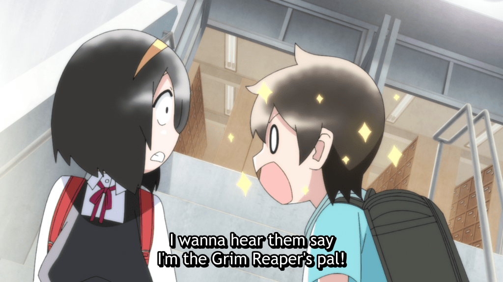 Some kids can be jerks. There, I said it. Some kids can be real jerks. Case in point: the students that think it’s a riot to make fun of Akane Nishimura. Why? Because she has piercing, glaring eyes and wears dark clothes. So naturally, they decide to call her “The Grim Reaper” and go out of their way to tease her and spread rumors that she has evil powers to curse people. Why? Because some kids can be jerks. However, for Taiyo Takada, a friendly new transfer student, the idea that one of his classmates could be a Shinigami is the best thing since sliced bread and he really wants to be her friend. Even when other kids try to recruit him into their clique, he only has eyes for Nishimura. At one point in the episode, Takada gets hurt and when Nishimura hesitates to come to visit him so as not to start any rumors, he genuinely feels hurt that she didn’t come for a chat. Of course, the two make up, and Nishimura admits that it’s nice to talk to this rather spazzy yet well-meaning odd duck.
