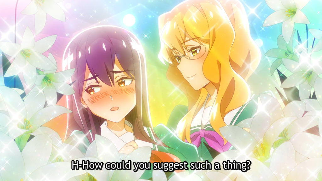 Intriguing and funny, though a little obnoxious, episode one of Yuri is My Job definitely has my attention. What the show so cleverly does is combine a number of different settings into one series: a maid cafe, a fine arts performance setting, and a boarding school—the latter two typically being featured in yuri stories. The boarding school is part of an act, which itself creates an interesting perspective as we get to watch these girls play at being schoolmates in a yuri romance. Meanwhile, the customers are absorbed in it (and even review performances online afterwards). The acting is all ad-libbed and done while the maids also serve and talk to the customers, all while remaining in character. This leads to another engaging aspect to the show, which is the theme of masking oneself. There’s obviously the dissonance between the “real life” personalities and their personas, with Ayankouji, whom Shiraki is probably destined to fall in love with during the course of the series, being the most obviously counter to her character. Well, Shiraki is pretty opposite, too, and is a fairly obnoxious lead, though hints at a tragic backstory offer hope that she’ll become more sympathetic. I also found it annoying that Shiraki is basically forced to work off a debt where she did nothing particularly wrong. There was some eye-rolling. But as flawed as the series may be, I’ll continue on to episode two. But those who typically avoid shoujo-ai and yuri series probably need not tune in; I don’t think this series will turn into anything earth shattering that would necessitate trying it out.