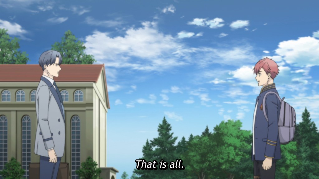 Guys, this is it: the boy version of Kizuna no Allele and the second most disastrous premiere of the season. I say second, because at least the plot is linear, even if the world-building repeatedly contradicts itself on a fundamental level, the writing is the very picture of lazy composition, the animation is wooden, the characters as generic as they come with flat expressions and eyes as vacant as the Abyss, and absolutely nothing even remotely interesting about it, even as a “it’s so bad that I just can’t look away” kind of thing. No rubbernecking at this crash site. What makes this one so bad is not so much the ridiculousness—it’s not even energetic enough to excite such a dynamic description—but the utter mundanity and mediocrity of every single aspect of the episode. The only remotely interesting thing about this is how on earth C-Station, the studio responsible for one of the greatest slice-of-life, “cute girls doing cute things” series of all time, Laid-Back Camp, pulled off such a nonentity of an episode. It’s not even a whole lot of fun to roast, in contrast to Kizuna no Allele, which begged a photo essay to supplement the review. This one just flops around limply like a dying fish, not even making enough noise to draw the attention of passersby. It’s so underwhelming that I’m not even going to bother daring the rest of the BtT team to make it through this one.