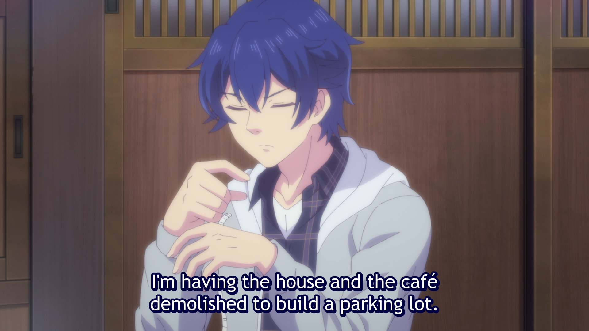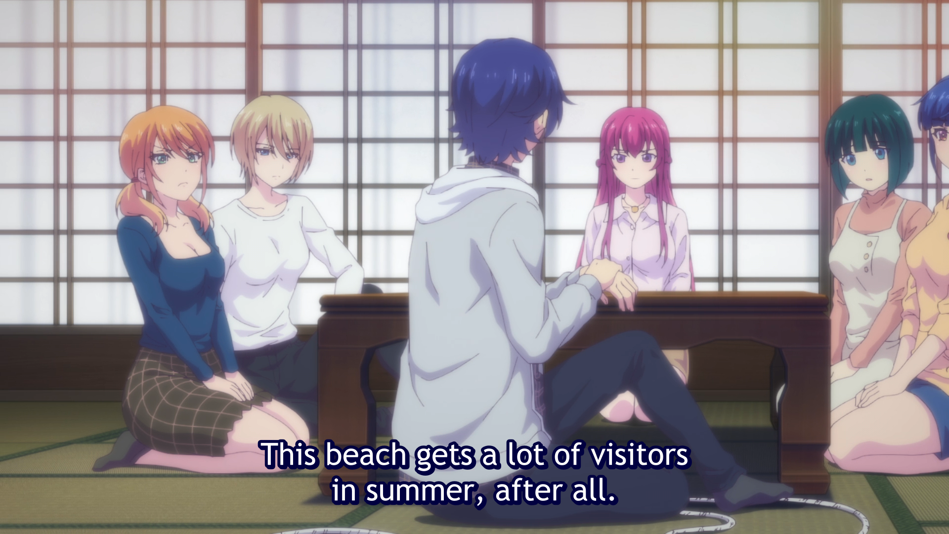 Hayato, who studies at Tokyo University, comes to visit his grandmother’s café during the break. His grandmother has passed so he was notified that he now owns the Familia Café. As he walks through the empty restaurant, he remembers how run down it was, when suddenly he’s interrupted by five young ladies—mostly naked and confused about why he’s there—who have been living in the café for about a year. Hayato asks them all to leave since he is going to demolish the place and turn the space into a parking lot, which is a more profitable business since summer attracts many tourists to the area. The girls are bummed and broke, so they come up with a plan to entice him not to tear down the establishment. Hayato is a tough customer though and doesn’t fall for their flirtatious advances or the meals they offer him. The next day, two contractors come by with an estimate for the cost of demolition, but Hayato starts to have flashbacks of the last time he saw his grandmother, and how he left her in the middle of an argument. As he does, Hayato realizes that now that she has passed, there can be no taking back those angry words. After reflecting on his past actions and looking at the ledgers (accounts, payments, debts, etc), Hayato decides to keep the café and see if he can bring the business out of the red and make it profitable again. The girls decide to stay when he asks what they want to do, but Hayato explains that it’s their fault for the café being in debt, and with that, the episode ends.