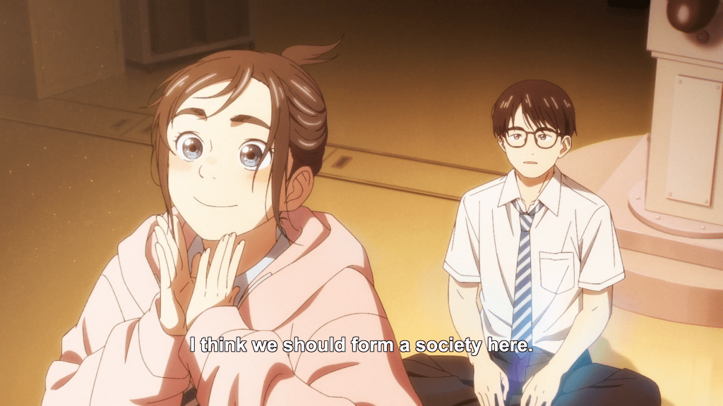 Out of the many shows slated for this spring anime season, this one has been close to the top of my list! I’m familiar with the original source material by Ojiro Makoto, and I’m also familiar with another one of her other works, Fujiyama-San Wa Shishunki, so seeing this work take animated form is a treat! Having dealt with a brief bout of insomnia a few years back due to the thoughts swimming through my head, I can totally attest to how the characters are suffering. That feeling of laying down with your eyes closed but not being asleep, the feeling of seeing that sunrise and getting up to face a dreadful day of pain and anguish that you don’t want to trouble others with. Praise God that I was able to overcome it thanks to some help, and it looks as though through kindred spirit Isaki and the Nightly Fun Society, Ganta might be on the road to recovery…and something more. It says something about the effectiveness of the writing that I’m able to fully relate to a character after just one episode. In under 30 minutes, I know who this dude is and I could put myself in his spot. That’s good writing, boys and girls.
