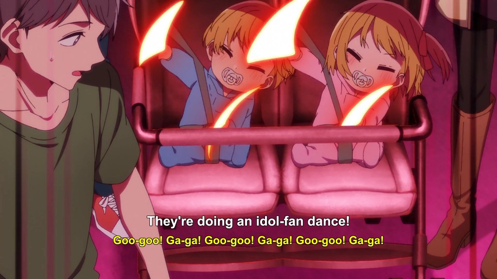 If act one was the mildly uncomfortable “let’s poke fun at otaku, no wait, is it ok to laugh at this?” phase of the story, act two is the straight-up comedy phase. Fortunately, things don’t go the way of Mushoku Tensei and Gorou, now named Aquamarine, is a gentleman determined to protect the honor of his favorite, er, Mom. His twin sister Ruby, however, ventures a little more into Rudy territory, but the joke doesn’t linger and soon the babies, who have both retained memories of their past lives (which involved stanning Ai), can walk and talk and most importantly, do the glowstick choreography for all of Ai’s performances. They are in heaven.