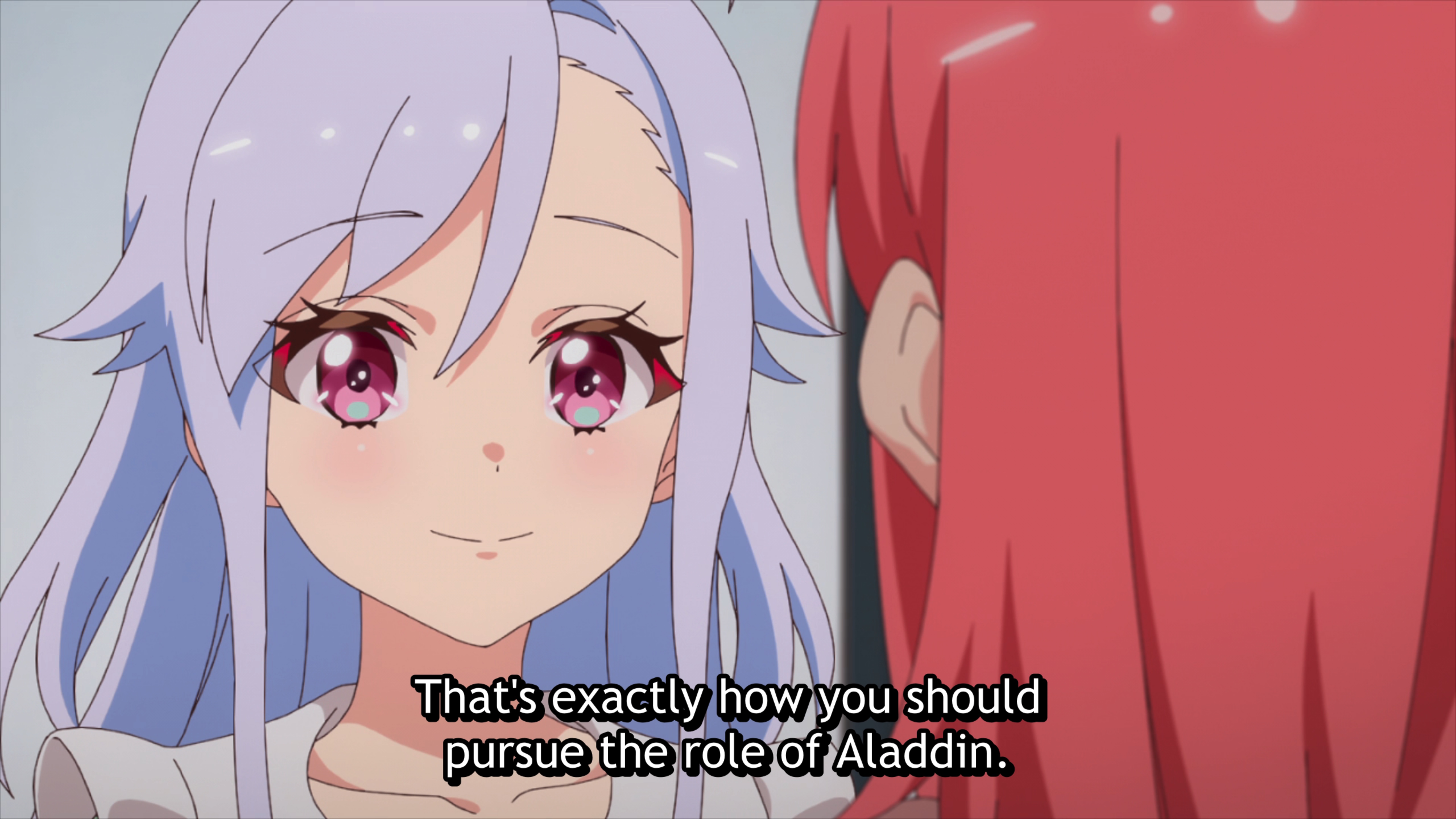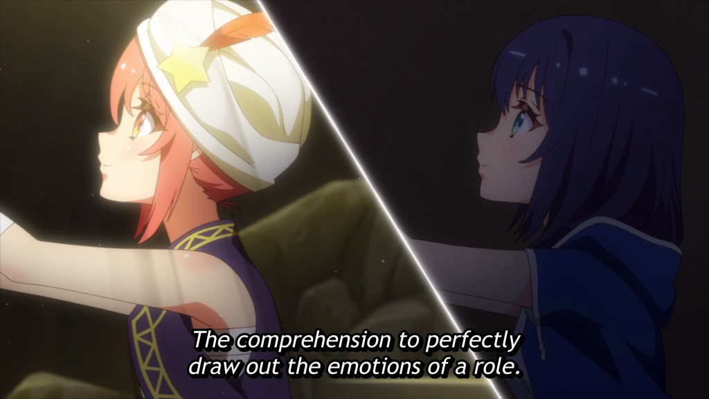 But a relationship is a two-way street, right? And while Shizuka may be the perfect friend, Kokona is painfully human. In episodes 5 and 6, overwhelmed with the prospect of playing the lead in Arabian Nights and still not fully aware of how to work with her Sense, Kokona begins to look elsewhere for guidance. Her eye is drawn to a different ideal, namely, her accomplished co-star, Yae, who charms and delights her, offering to lift from her shoulders the burden of figuring out her role. Yae sweetly tells Kokona how to play Aladdin and, relieved beyond measure and dazzled by the starlet’s attentions, Kokona lets herself become swept up in serving Yae’s vision of the performance, which just so happens to reduce Aladdin to a foil for Yae’s character, the Genie. Kokona shifts her trust away from Shizuka and onto Yae.