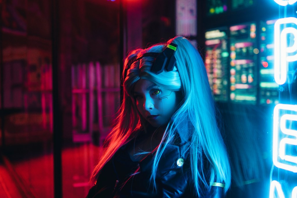 Photographers Abisai Elizondo (set one below) and J.A.Vilches (set two) really helped me bring her to life! Also, shout out to @Abisai_photography for making the gauntlets and weapon prop! We took these photos at The Rice Box in Houston, the perfect place for neon cyberpunk vibes.