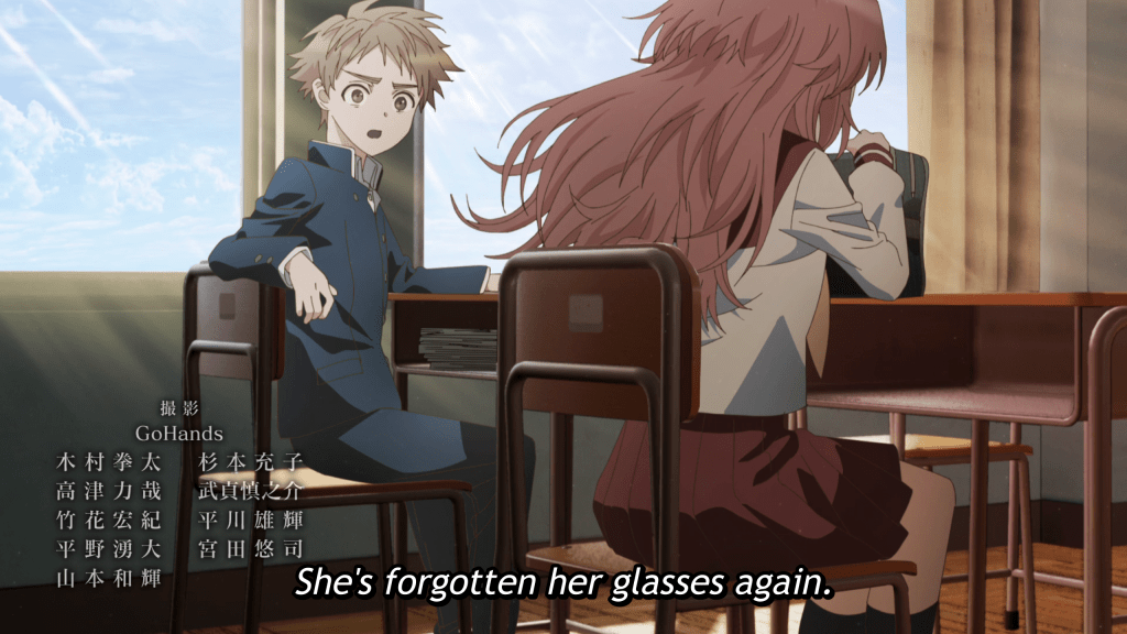 I’ll echo stardf29’s sentiments here—once the episode stopped showing off and transitioned more or less into a regular romcom, it became much better. In fact, the opening episode was delightful. Mie is a funny character (both “funny: haha” and “funny: is there something off about her?”) and Komura’s thoughts were cute and entertaining. I’m worried that Mie somehow being so blind that she can’t see her hand in front of her is going to wear down as a plot device pretty quickly (I’m that blind as well and could never forget my glasses or contacts, and always had emergency pairs when I was young!), but if the show somehow finds a creative way to make it work, the series could be a fun ride.