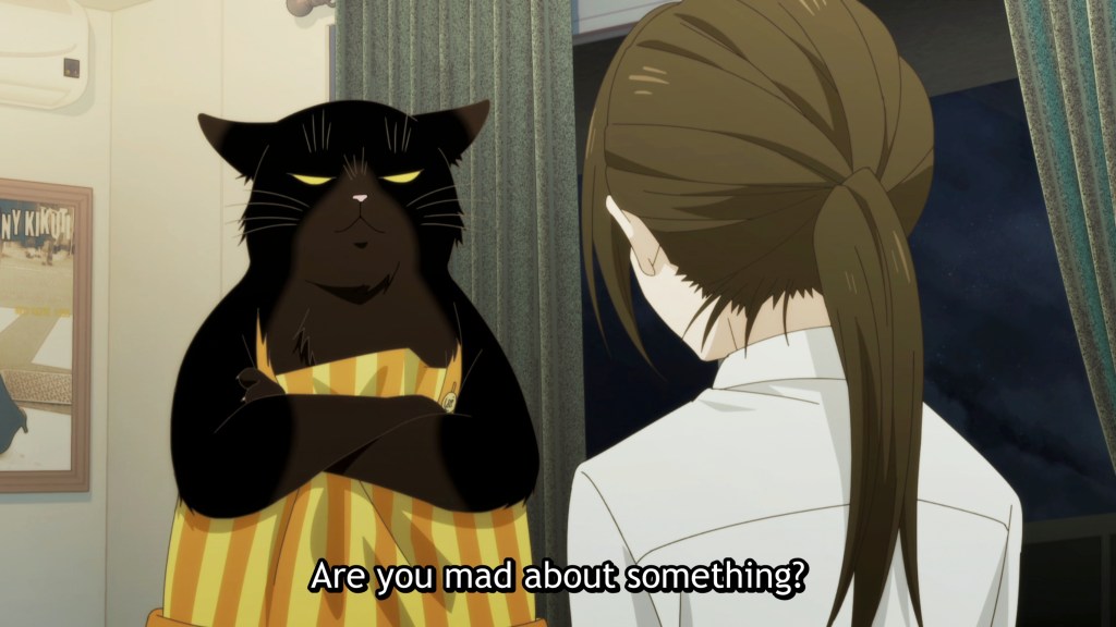 As for the story, the episode itself was not terribly exciting—a kind of “rinse, dry, repeat” pattern marked out by mealtimes—but it was quite sweet. Yukichi may stand like a human, but he’s still very much a feline, and his little cat-like habits (the ear flicks, the pestering of his sleeping owner, and his expressions of disapproval) are endearing. It’s also pretty clear that romance is in the air for Saku and her boss, which will of course instigate the greatest dramatic plot line of the modern era: Will the cat approve of the boyfriend? All in all, this was a pretty interesting premiere, and I’ll be sticking around for a bit to see how it plays out.