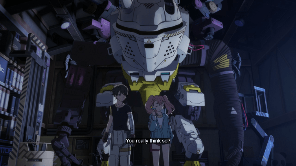 …so far the worldbuilding is great. The Domes are a living, breathing world with fake sushi, aerial transports and human-robot friendships. The visuals are beautiful, with non-terrible CGI, cool environments and great landscapes (see the sunset at the top of this post, for example). So, what’s not to like? Well, just now, the characters are the biggest obstacle for me. Don’t get me wrong, they are likable enough. But for the most part, they fall into the same mecha stereotypes we know well: the oddball young mentor, the tsundere-ish pilot, the innocent, emotionless prodigy, and the self-doubting Boy who gets into a mecha. I was also put off by some off-color jokes. Will I be able to overcome this creeping feeling of “seen there, done that” and give them a chance, hoping that the show will do something new with them? Yes, I think so.