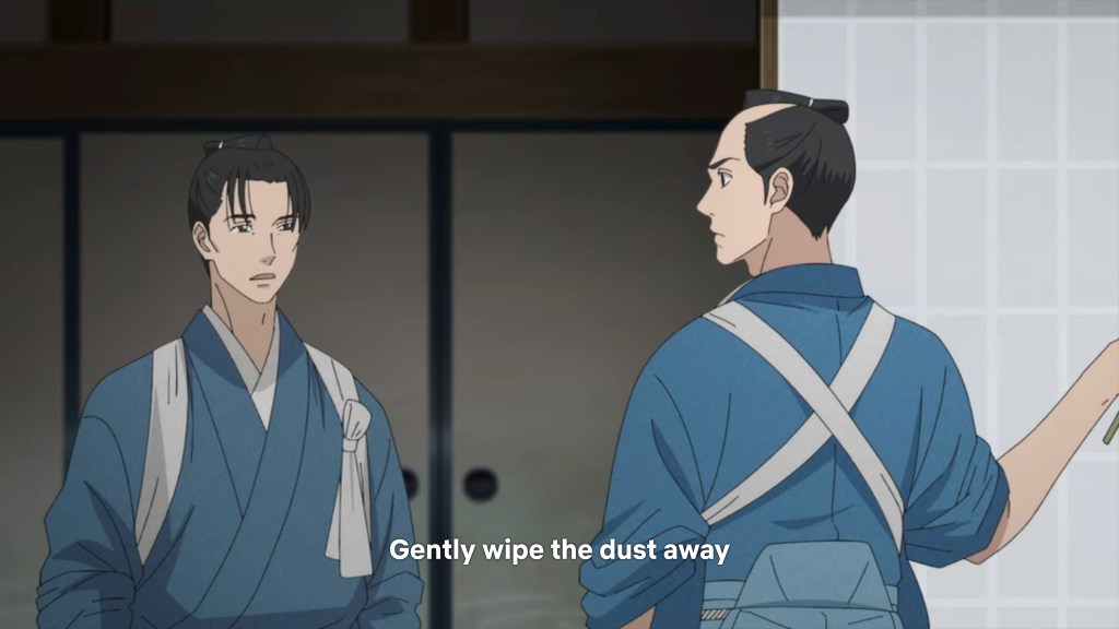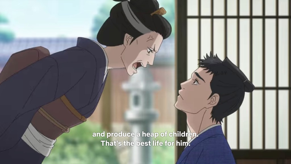 This was such an interesting premiere! At a runtime of 80 minutes, it rivals last season’s Oshi no Ko opener. But that’s not where the comparison ends. Like Oshi no Ko, this first episode cycles through several different genres, pulls a major plot twist that redefines the entire trajectory and focus of the series, and refuses to shy away from the seedy underside of an aspect of Japanese (feudal) society that is often romanticized—the royal court. Mizuno is threatened with sexual assault, and it is clear that such abuses are ingrained in the culture of the court, though the story thankfully does not linger on these harrowing moments. Courtly life is not simply manipulative and deceitful, it is also cruel and destructive, regardless of whether it is the women or the men doing the household chores. In this way, the series’ exploration of gender roles and power dynamics manages to steer clear of a simplistic inversion that either “solves” society’s problems by swapping men and women or, alternately, replicates them almost fatalistically. Instead, the Ooku reveals how some things have changed while others have stayed the same with the loss of so many men. Which is what makes this such a clever and coherent reimagining of shogunate-era Japan! What’s more, I could even go so far as to say that this is the most believable version of the “all the men have disappeared” trope that I’ve come across, which is saying a lot as I’ve read my fair share of 1970s feminist sci-fi.