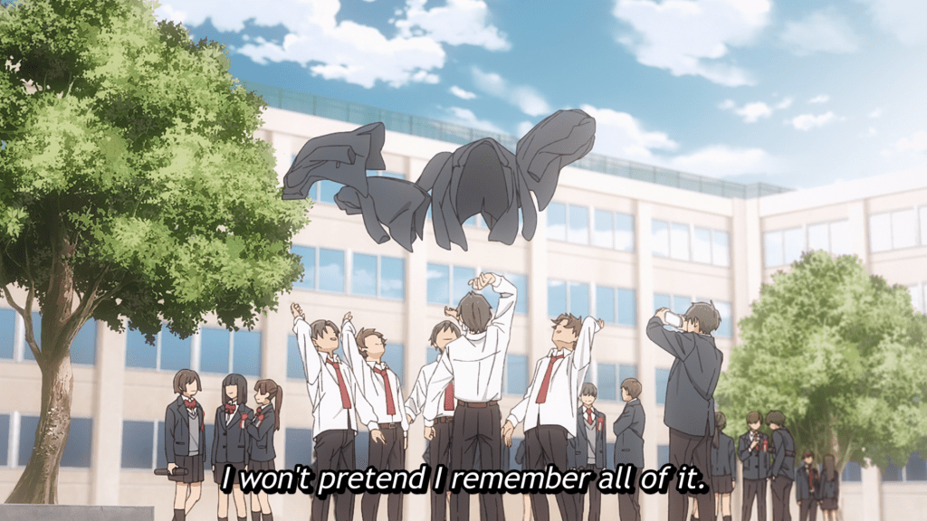 I wish I could give a more definitive answer, but my response is piecemeal as well. It is great fun to see these characters again. The original was initially so fantastic because of these wonderful characters, lovely music, great animation, and powerfully nostalgic tone. But in the end, it didn’t work, because only Hori and Miyamura’s story felt complete; we didn’t get to know most of the other characters well enough to care about them finishing their arcs, and so The Missing Pieces enables us to get to know these boys and girls (and adults, too) a little better. But the framework of the original show makes this side story a little odd. It jumps around in time, which sounds creative and could make sense, except that, again, I don’t know these characters very well, so it’s hard to reminisce about and enjoy their stories fully. I do think manga readers (I’ve only read several volumes of it) will like this show, though, and my hope is that, once the side story anime is complete, someone will post a chronological watch order integrating it with the original series. Maybe then, we’ll get the Horimiya we deserve—not in pieces, but a complete, beautiful tale, as it was meant to be.