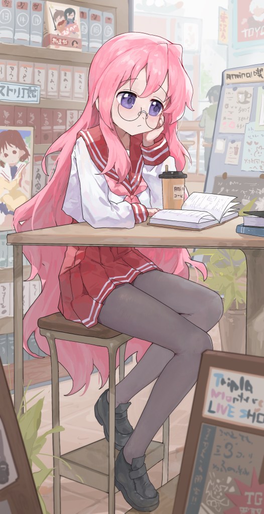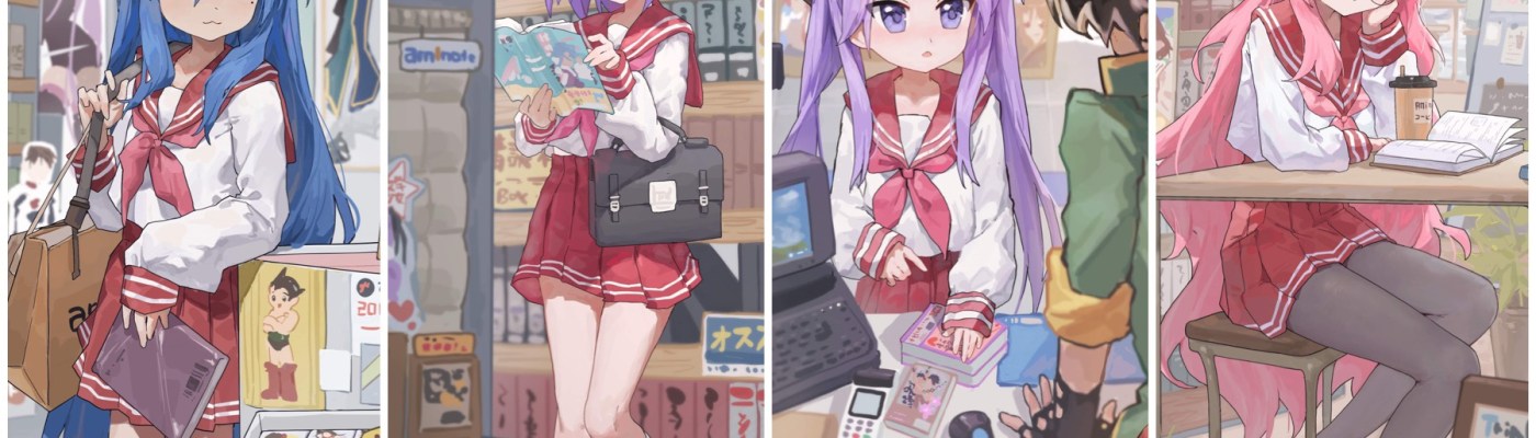 Oooh, it’s our group of girls from Lucky Star! I haven’t thought of this series in YEARS. And they are hanging out at an anime shop!