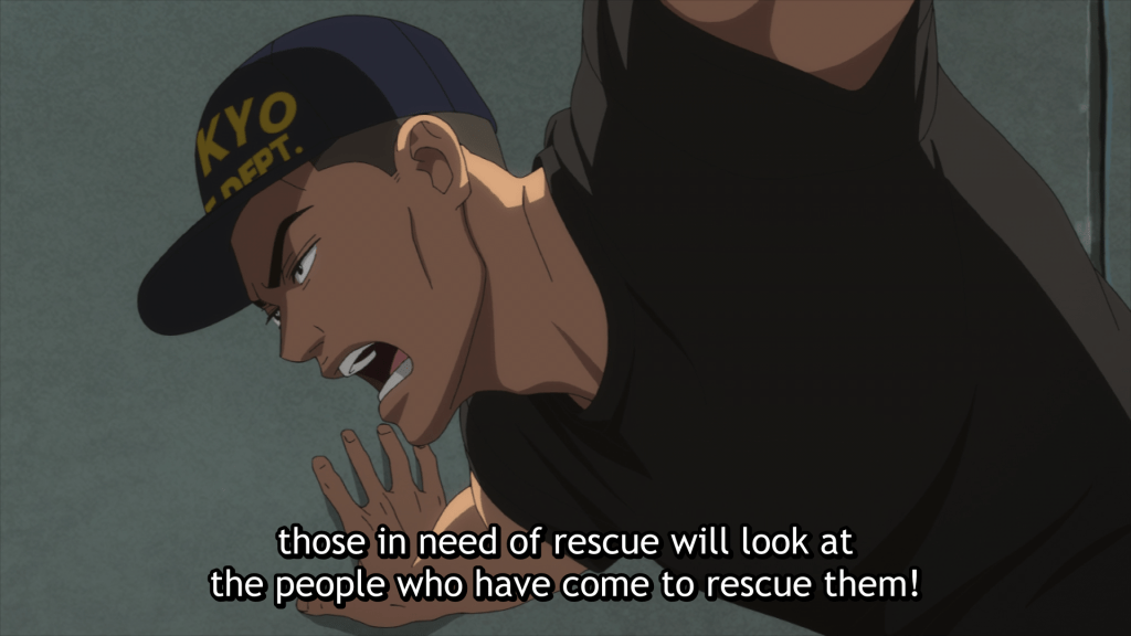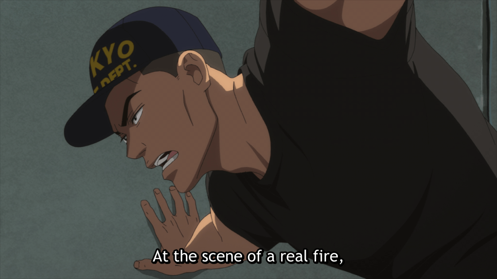 With Tokyo burning and Edogawa ward being destroyed by fires (and something else too?), fire sergeants and partners Daigo and Shun venture into burning buildings to help those trapped inside. With Daigo pushing himself further than what is deemed safe, the stakes feel higher than usual as they rescue those affected by the smoke, as well as a fallen comrade who is started on oxygen immediately. With lives in the balance, Shun watches as Daigo safely makes his way to the ground with an unconscious child, receives aid, and encourages those who seem to have lost everything. Once the rescue concludes, the episode flashes back to reveal who these heroes were in their rookie days and the brutal training they went through. While Daigo and Shun are partners in the present, it doesn’t seem that has always held true in the past. Just how far have they gone to become the people they are today?
