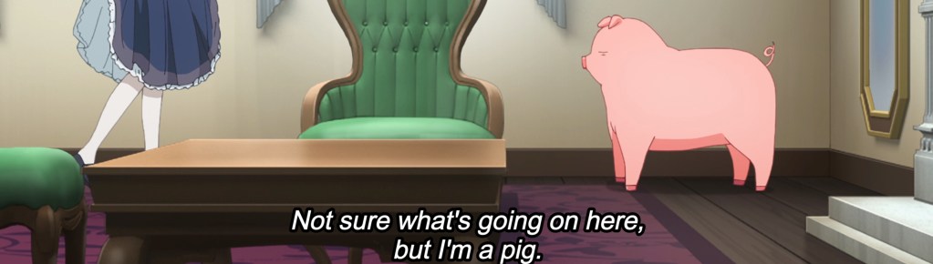 Mkay. Thanks for that, anime-san. I mean, I should have expected it from the studio, Project No. 9, that brought us some of the most unsettling ecchi-not-ecchi series of the past year or so: My Tiny Senpai, and Miss Shachiku and the Little Baby Ghost. They’ve made an art of producing series that don’t necessarily look like ecchi (that is, no nudity), but holy jumpins, sure are problematic in the way they objectify women, children, and so on. Here’s another “gem” in that vein! I’ll admit it, I have a pet peeve for series like this that, in order to make the male lead come across as a nice guy, use the limitless creative potential of fiction to conjure up a reality where either every other man is a complete jerkface or the female lead is so disenfranchised and lacking in self-worth that she willingly acts in a slavish manner so that the ML can throw a couple of lines expressing basic human decency her way and come across as so utterly magnanimous that he gets a free pass to act like a patronizing, lecherous perv to his heart’s content. We haven’t met any other male characters yet, so I can’t speak to the first conceit, but the second one is here in spades. You know, the kind of spades used for cleaning out pig sties. And yes, I am aware that the whole ”man turns into pig” thing is meant to be a witty self-reflective commentary on the “men are pigs” stereotype but frankly, the writing is neither witty enough nor self-reflective enough to pull this off and instead it comes across simply as self-indulgent, juvenile wish fulfillment. Pig-san talks an awful lot and he talks an awful lot of rubbish. It gets boring really quickly, and you can see the layout artists were struggling to try to make these long monologues somehow engaging visually. Unfortunately, that often means random canted angles or focusing on Jess’s skirt fluttering provocatively in the breeze. I had actually been mildly looking forward to this one, thinking that it had great potential to use humor to critique the “men are pigs” stereotype. But instead it seems bent on proving it to be true and even rebranding such behavior as noble and kind. Also, for a series starring a pig, the porcine character design is pretty lacking. Guess they were spending all their time on Jess’s underpants.