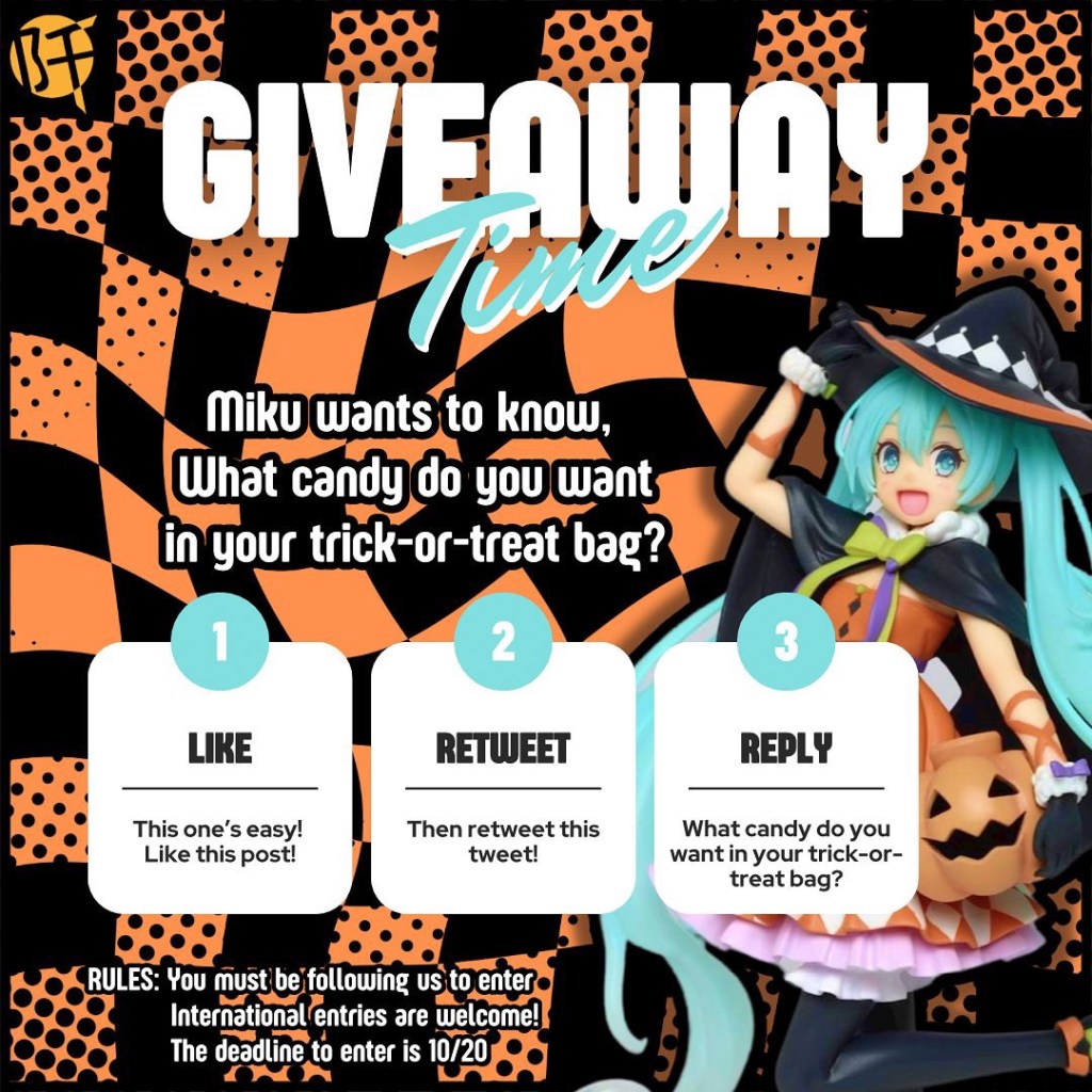 Hello, boys and ghouls! Halloween is just around the corner and nothing says spooky like…Hatsune Miku? Well, at least she’s dressed as a witch and ready to trick or treat! Come win this kawaii figure of her!