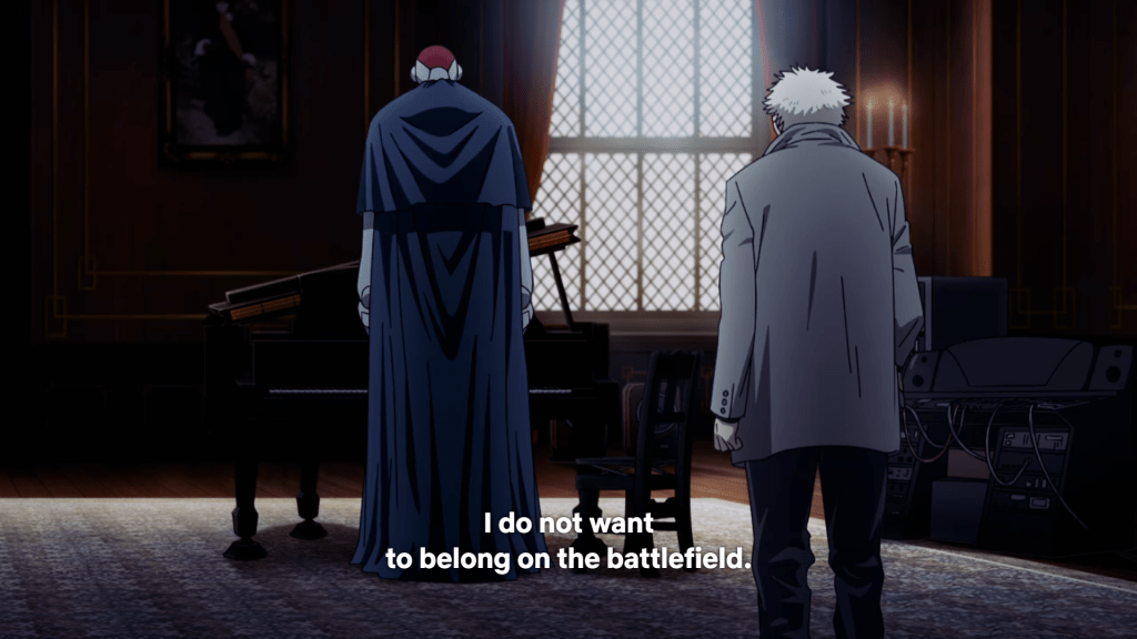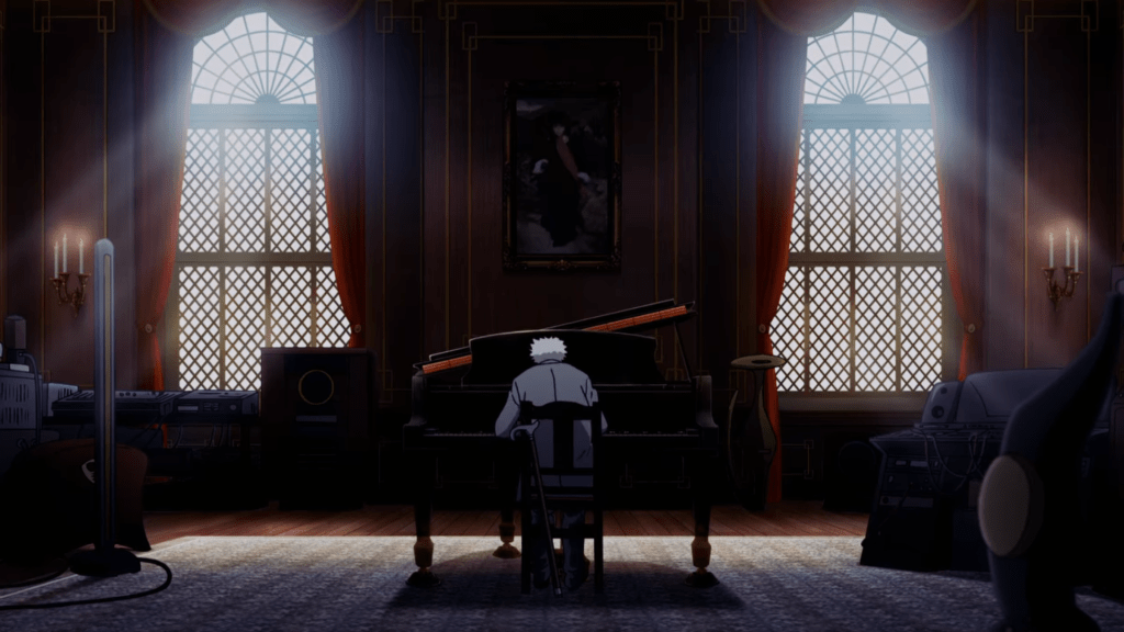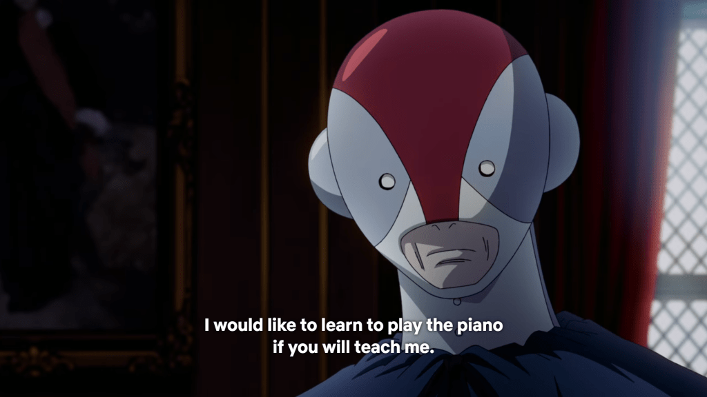 Gesicht finds evidence of the assailant after speaking with the metallic wife of the victim, enough to conclude with the local police department that the criminal is after seven powerful machines that participated in the 39th Central Asian War. The episode transitions to another part of the world where a retired pianist named Duncan, renowned for his classical work, lives alone in a Scottish castle. He has had several butlers assist him but he ends up firing all of them as he wants nothing to do with anyone. A nightmare plagues him in which he runs after his mom who abandoned him for the man who used to own the same castle he now lives in. North No. 2, a new robotic butler, politely offers his services to Duncan but is also rejected and asked to leave. Several times this mysteriously soft-spoken machine asks to be taught to play the piano after hearing his master play it. After some backstory is given for each character and a climactic battle occur, the hour-long episode ends with Gesicht meeting a boy in the rainy streets of Tokyo named Atom.