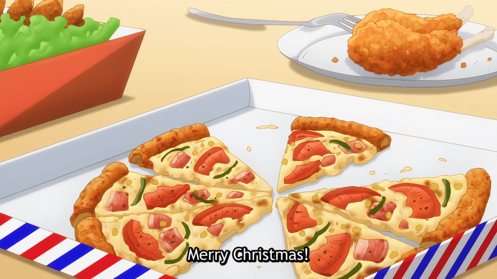 Christmas arrives relatively early in The Angel Next Door Spoils Me Rotten. Near the end of episode three, Itsuki and his girlfriend, Chitose, convince Amane to let them have a Christmas Eve party at his apartment. The pair assumes that Amane will be alone, so it’s a perfect opportunity for the lovebirds to spend some time together (Itsuki’s father disapproves of his relationship with Chitose) and hang out with their friend.