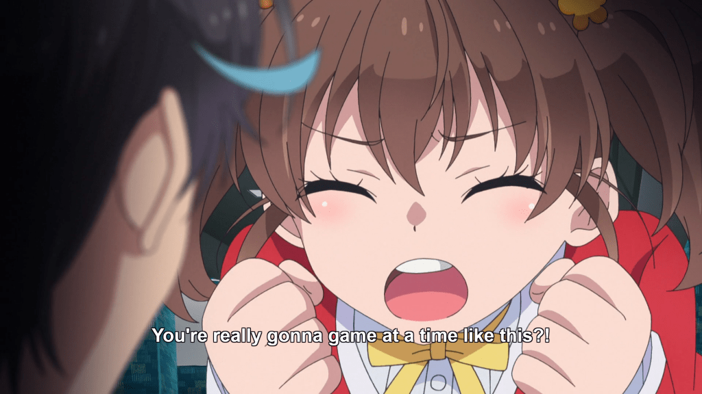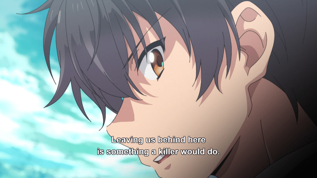 By the end of episode one, My Instant Death Ability is Overpowered won me over by emphasizing the more intriguing elements of the light novel series (at least for me) while downplaying the series’ shocking violence. The deaths are still there, of course—the protagonist is a stone-cold killer—but I’m surprised that the anime doesn’t make the deaths more gory and visual. Instead, it goes for a more jaunty tone than a shocking one, whereas the LN alternates more regularly between the two. Still, the element of danger is very much here. While the protagonist is OP, so, too, is the first antagonist, Shion, as well as, presumably, the classmates who betrayed Takatou and Dannoura. That element of fear is much welcomed, as is the humor, even if it’s a bit skeevy. I don’t know how future episodes will go, but judging from this initial one, it seems like the fanservice is used mostly to set up laughs; there isn’t a lot of dwelling on sexuality in episode one. More time is spent subtly characterizing the protagonist pair and the rest of the cast. Takatou and Dannoura are fascinating, the former because of his lack of inhibition combined with such a deadly power, and the latter because she’s no damsel in distress and is instead a realist, understanding the situation she’s in and already making difficult choices that test her ethics. And the class deciding to abandon those who are powerless sets the stage for some thoughtful questions about the corruption of power. All in all, I’m delightfully surprised by the first episode of this adaptation, which seems as if it would rather be good than merely titillating.