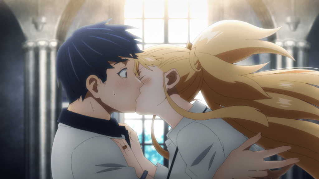 When he arrives on the scene, Himeno explains she’s returning to her world to fulfill her duties as a literal Princess and be married. When she steps into the light, Satou decides to follow his princess and yeets himself into the pillar of light and right into the middle of the wedding ceremony. Before anyone has a chance to process this, a giant monster crashes the wedding and Himeno’s grandpa tells her to give the prince she was going to marry one of the two wedding rings she wears around her neck. HOWEVER, baby girl decides she wants to put a ring on Satou’s finger instead. This, plus a customary kiss, awakens a power in Satou who One Hit KOs the monster and passes out.