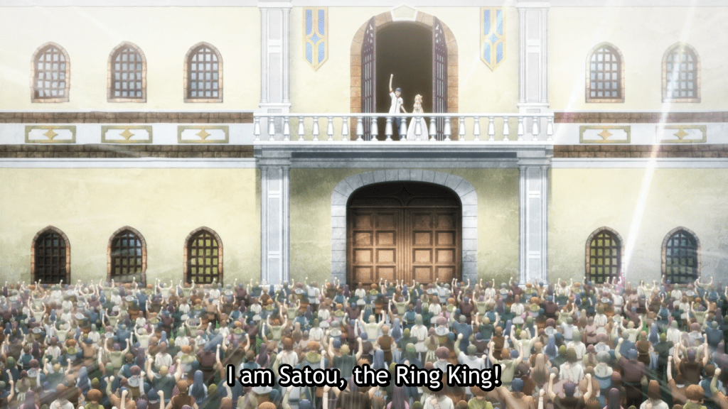 When Satou comes around, Himeno explains that she really didn’t wanna marry the prince and in the heat of the moment, picked Satou to be the Ring King—a legendary hero to save the world and unite the lands. Later in the bath (because of course) Himeno apologizes for dragging Satou into these shenanigans, but Satou brushes it off saying that he’ll stick around and be the Husband to the Maiden of Light, protecting her as he always has. However, before they really have a chance to admit their true feelings, there’s another attack incoming…because of course, Ring King Satou has to prove his worth.