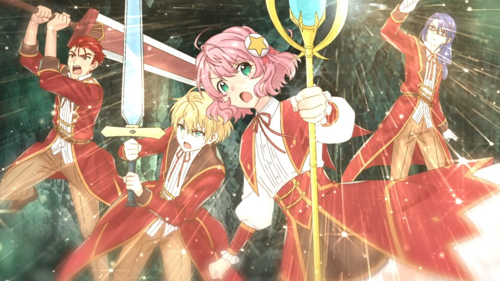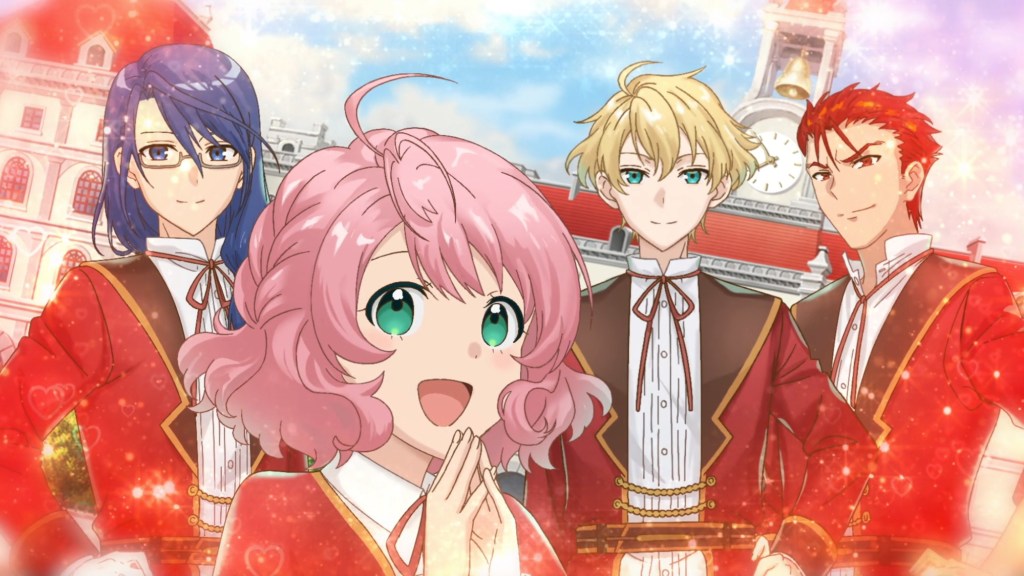 Alicia Ehnleit is a sweet girl, but sometimes that kindness of hers can be a hindrance, like when stopping to heal someone makes her late to the magical academy she’s due to attend, meaning she gets locked out as the curfew bell rings. Then again, it’s that sweetness that keeps her mood cheery and charms the government minister’s jerk of a son who locked her out, setting him up to become her first conquest of the heart, no doubt. And also setting Alicia up to encounter a general’s son next, as she scrambles over the wall and into campus. And then the second prince of the kingdom as she lands on him after falling through a skylight while breaking into the dorm. All this before the opening credits roll! Which they do now…but for the wrong series?! Ah, so this is a mediocre otome on purpose! The next day, the opening ceremony bleeds into a final confrontation, three years later, and the game finishes as the real MC is revealed: she’s a former college student who had a close encounter with Truck-kun and reincarnated—not into her favorite game by any means, just into a run-o-the-mill game, but at least a) she’s the ultra cool villainess who is actually the ultimate hidden boss, and b) no one knows how powered up she is so if she can just lay low and avoid triggering the secret boss ending, she can live a peaceful life. And then the teachers have to go and bring out the sorting hat level-reading crystal ball during the opening ceremony. Sigh. So much for staying incognito!