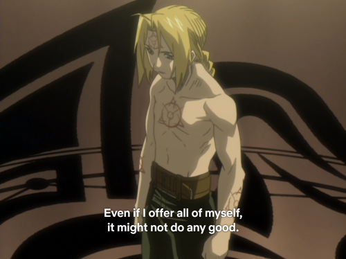 The price is Edward’s limbs and Alphonse’s entire body. But even after learning the hard way that he doesn’t live in a humanist world, Edward stubbornly remains a humanist. He curses the taboos and mysticism that he cannot deny. He dreams of a world of human progress and alchemy. But his dream proves to be a tricky one. Humanity’s main problems are not external. They are in us. They are us.
