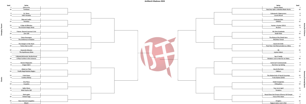 Our play-in matches are complete and the field of 64 for AniMarch Madness is set! Check out our bracket below: