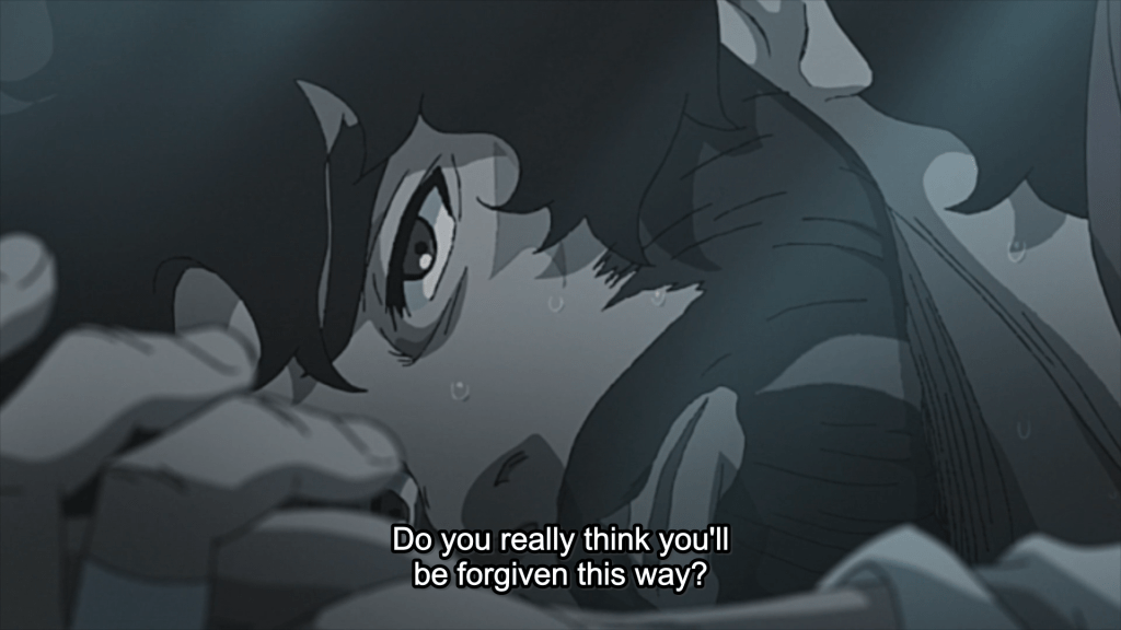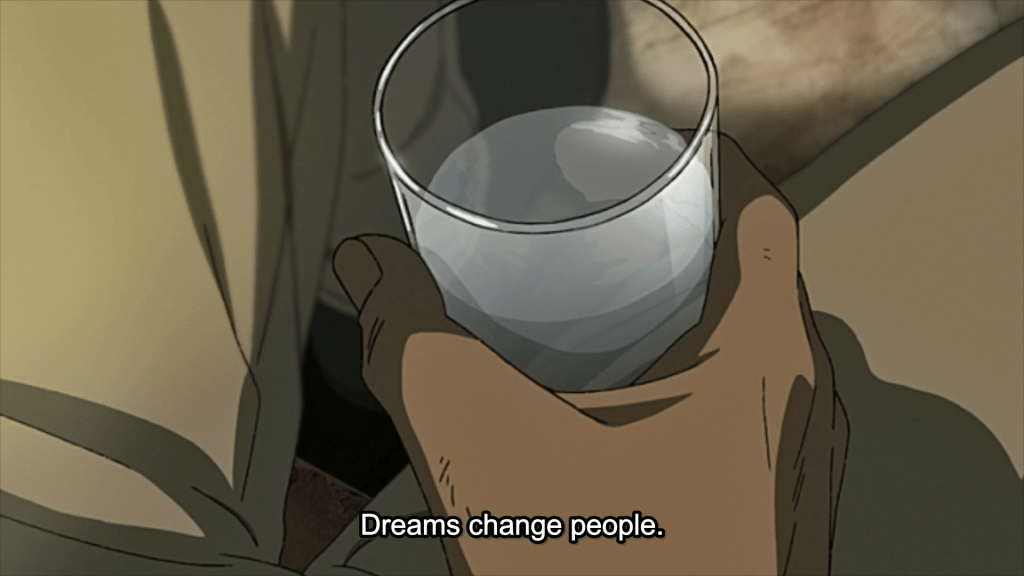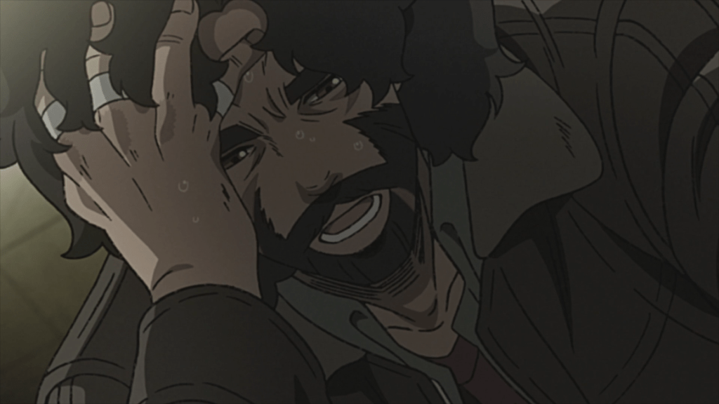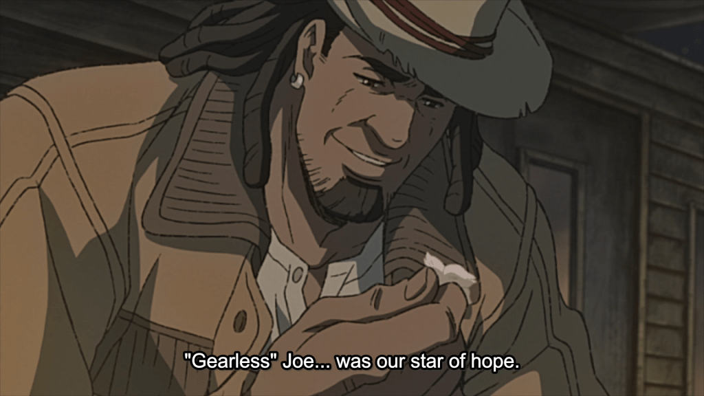 The once-proud hero and champion Gearless Joe was now a drunk and popping pills to ease his pain. He has hallucinations of Nanbu blaming him for leaving the orphans, his friends, and his future for a bottle of alcohol and addictions. It was hard to see the protagonist from season 1 who I was encouraged by fall into the lowest of lows and wallow in despair.