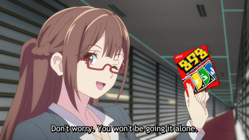 A final negative is the animation. Though not quite as bad as the sneak peak made it seem (there’s a shift that happens when the players enter a game which makes the world a little blurry and highlighted, and which may work in this series when only done in the game moments, but which would get old real quick if it’s the typical animation), there are plenty of moments where the animation isn’t great (see below), with mouth flaps not quite hitting their marks right, and inactive animation disguised by CGI movement. All that won’t matter too much, though, if the series can make the games as fun as they are in the LNs—and judging by the mini-game that takes up the second half of episode one, that could very well happen. I hope it does, and I look forward to the rest of the show with the cautious optimism that it will.