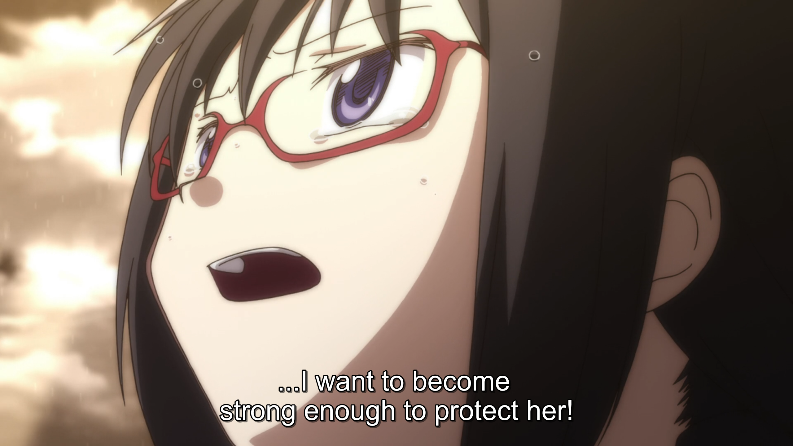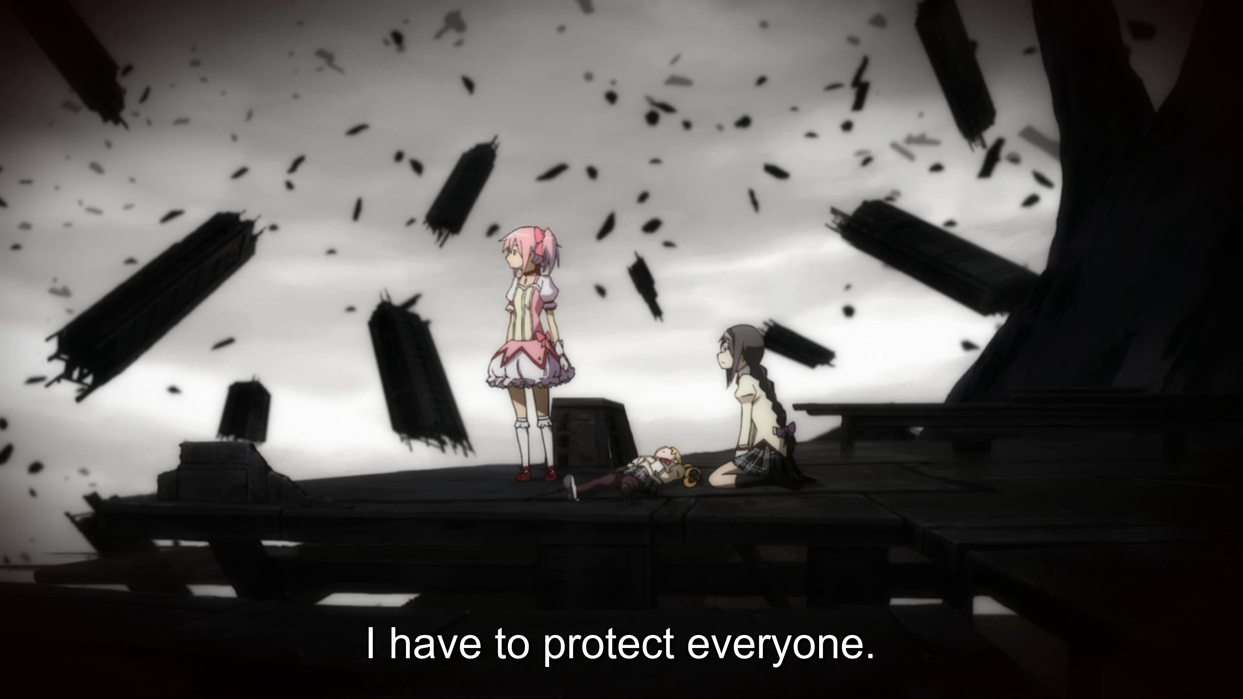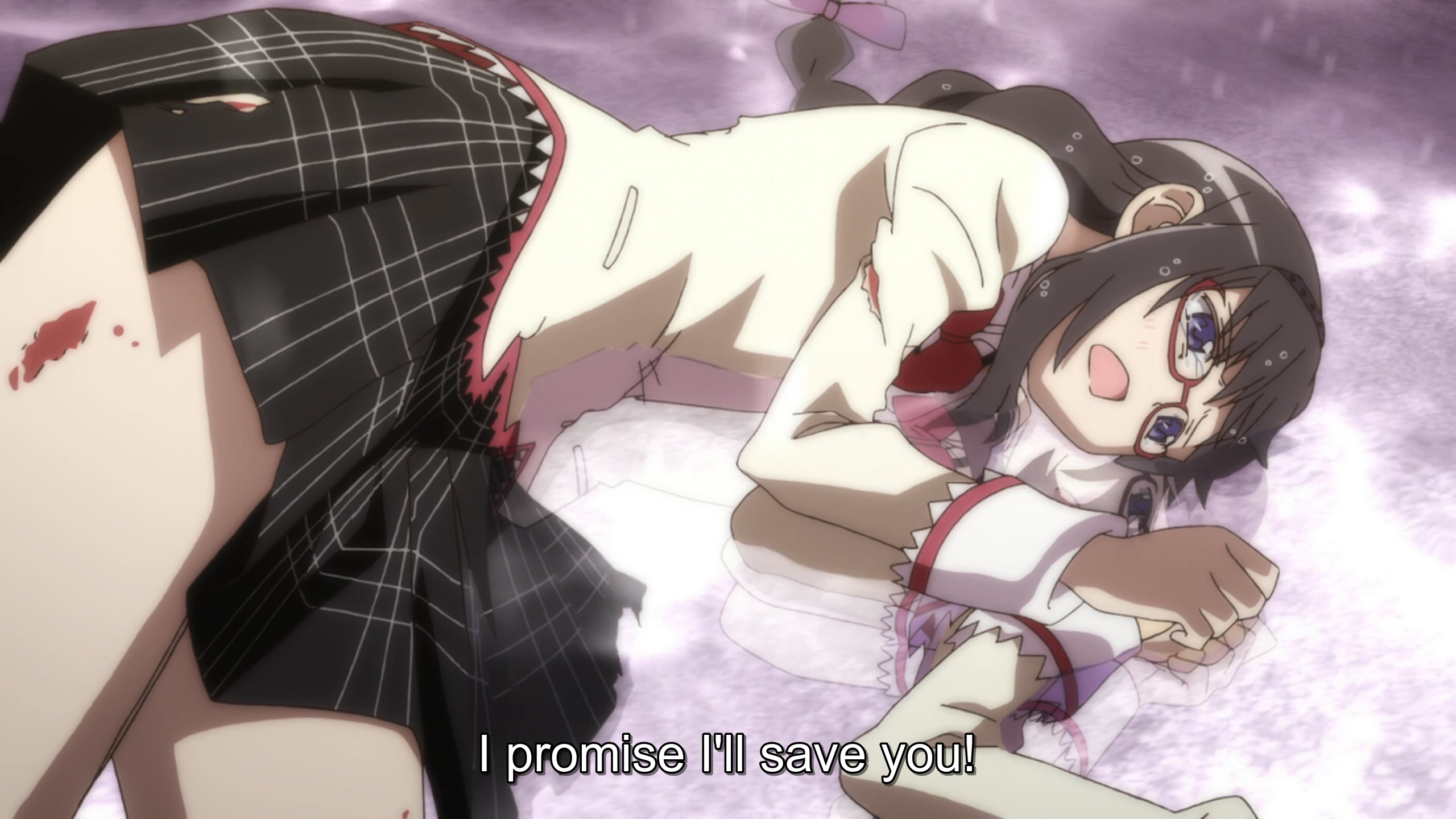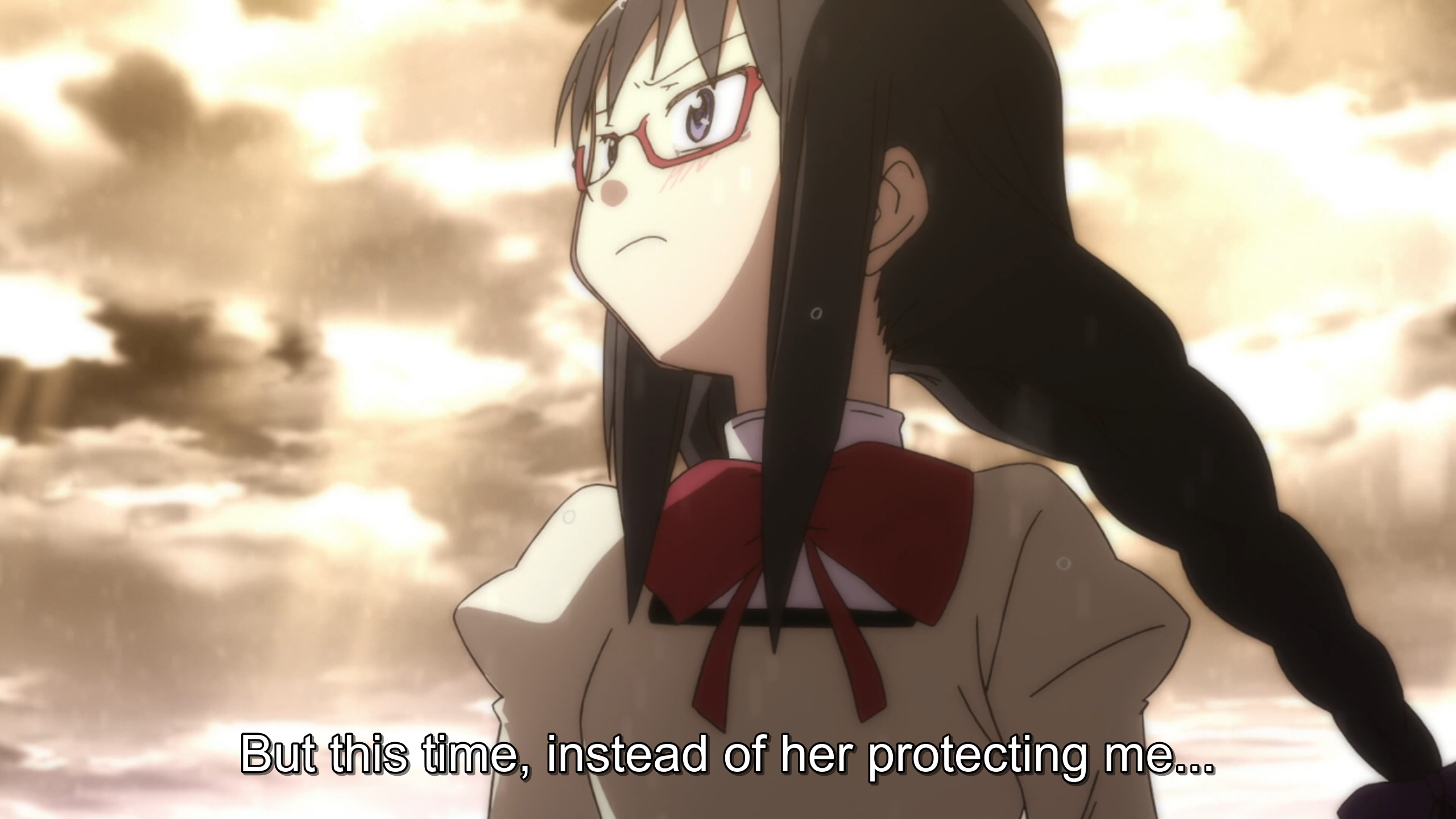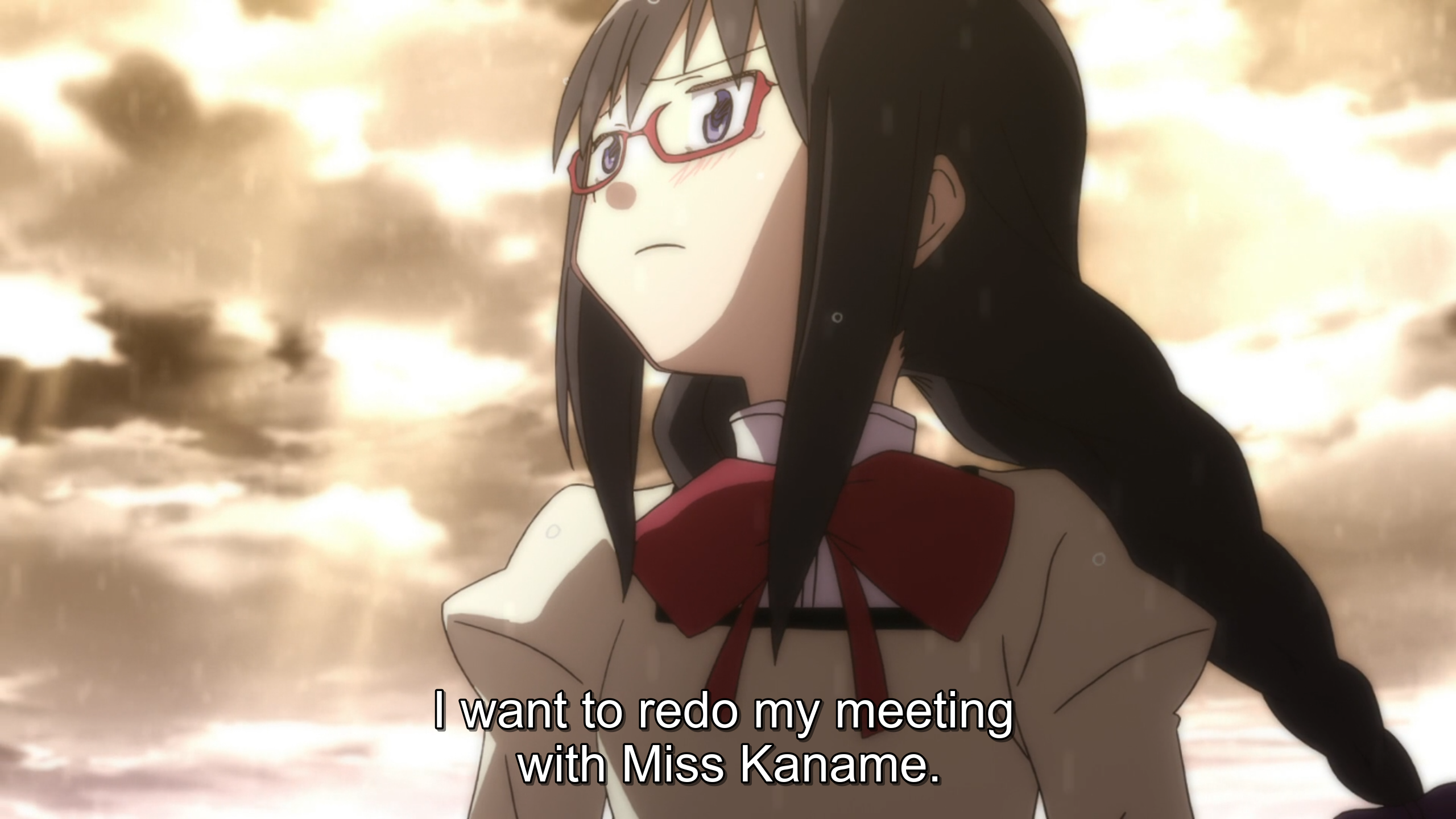 In episode ten, we see that, originally, Homura was a weak and insecure girl in dire need of a savior. Madoka fulfilled that role for her, saving Homura not just from physical harm when she found her cornered in a witch’s labyrinth, but from her insecurity as well, by becoming her true friend. Then, Homura goes on to witness the greatest tragedy she could imagine. Her only friend saves her again, but this time at the cost of her own life. Madoka made this heroic sacrifice gladly, but Homura could not receive it so. It was too bitter a sacrifice to lose her friend.