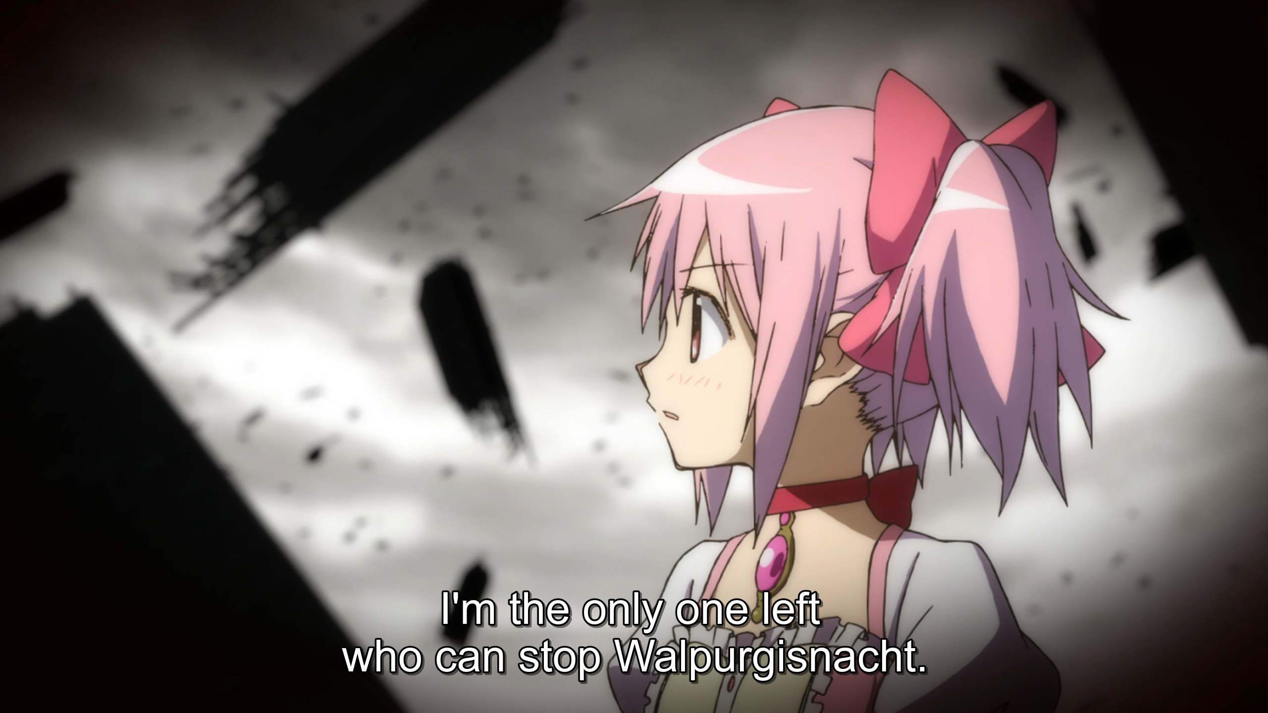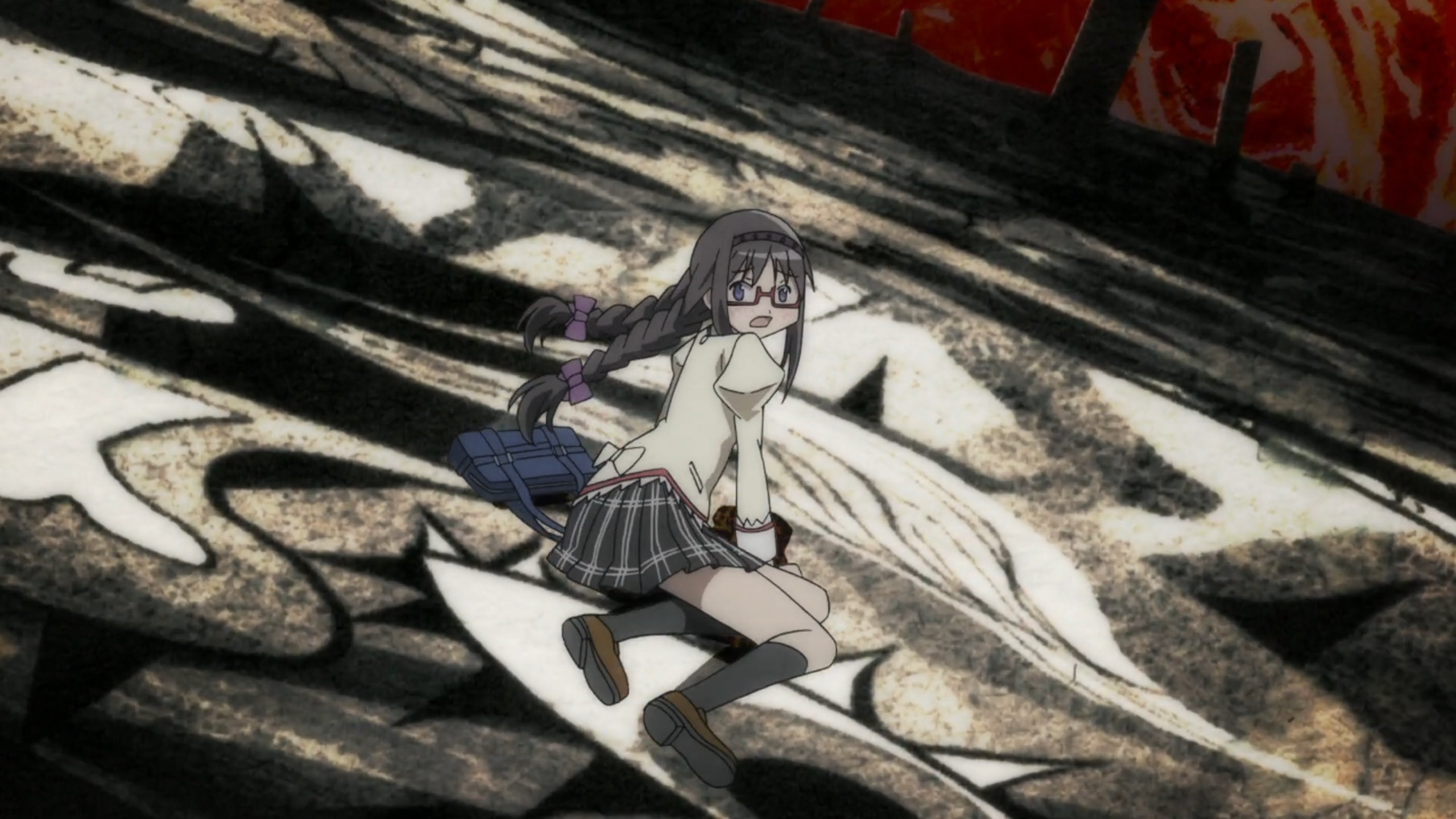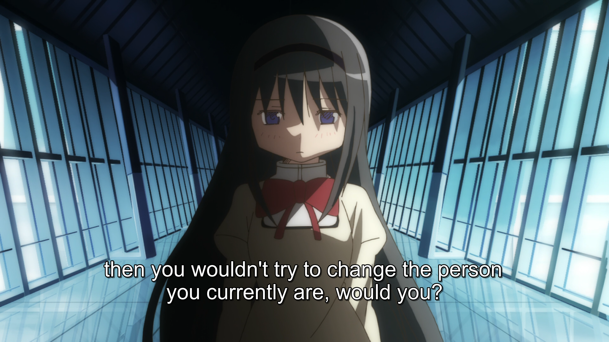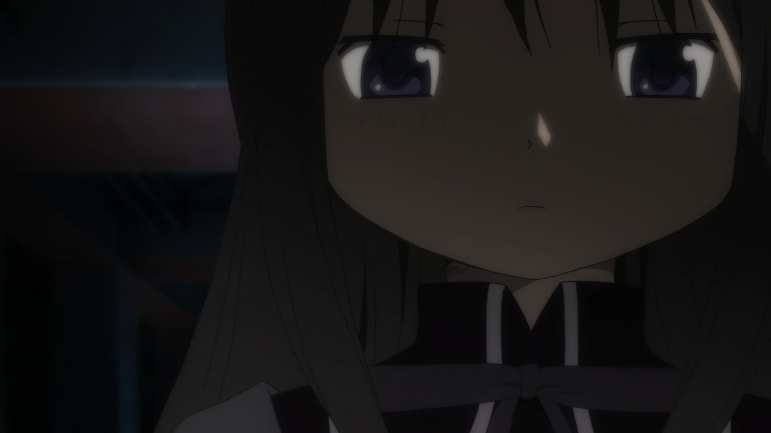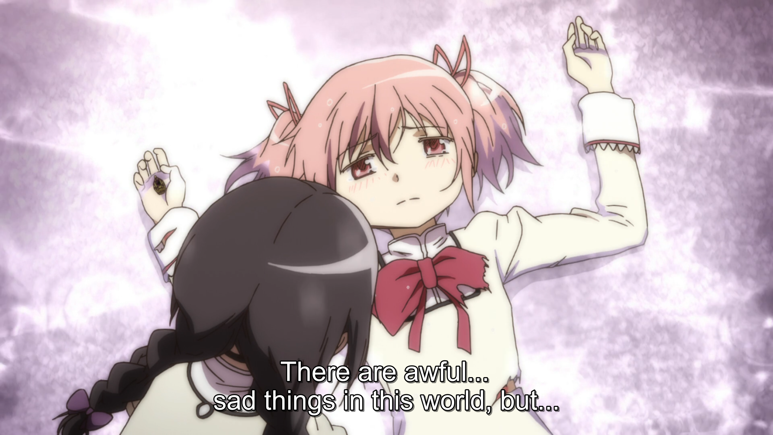 In episode ten, we see that, originally, Homura was a weak and insecure girl in dire need of a savior. Madoka fulfilled that role for her, saving Homura not just from physical harm when she found her cornered in a witch’s labyrinth, but from her insecurity as well, by becoming her true friend. Then, Homura goes on to witness the greatest tragedy she could imagine. Her only friend saves her again, but this time at the cost of her own life. Madoka made this heroic sacrifice gladly, but Homura could not receive it so. It was too bitter a sacrifice to lose her friend.