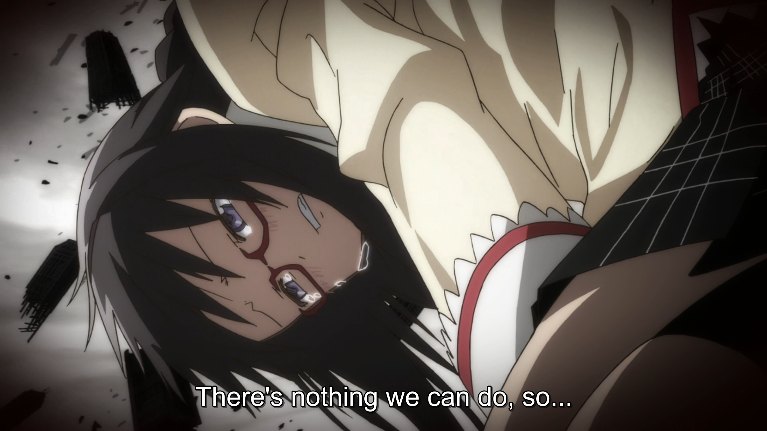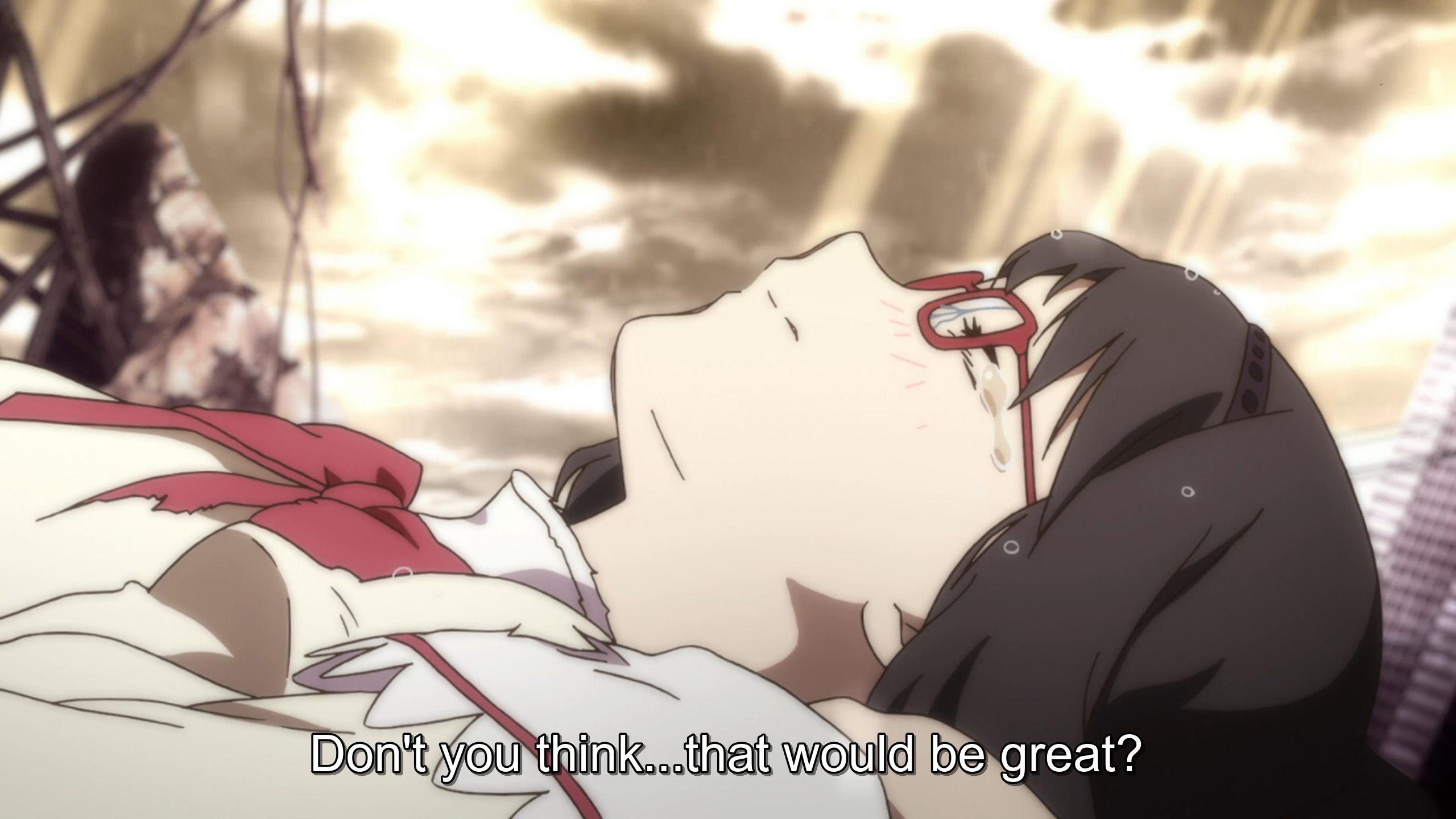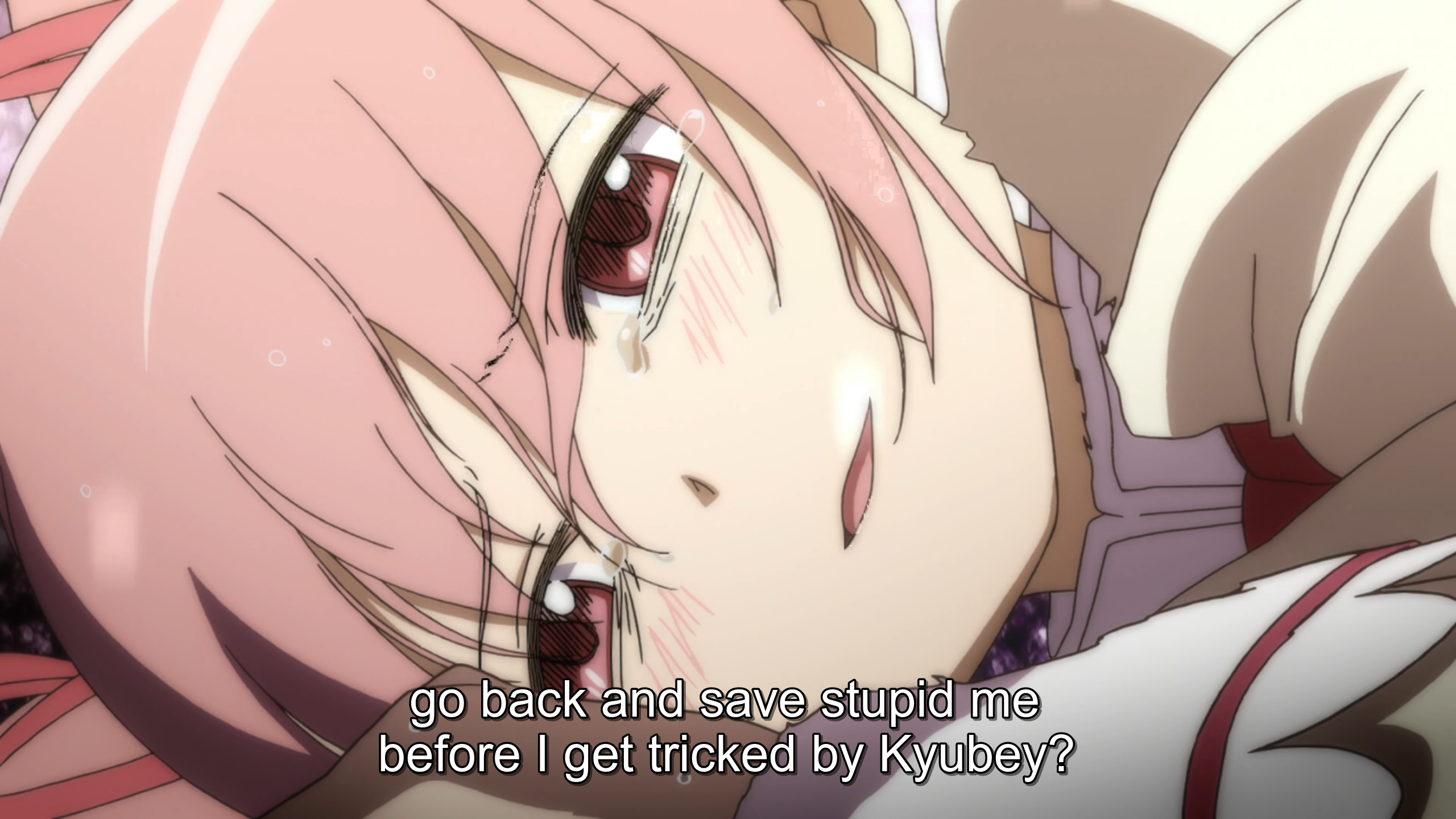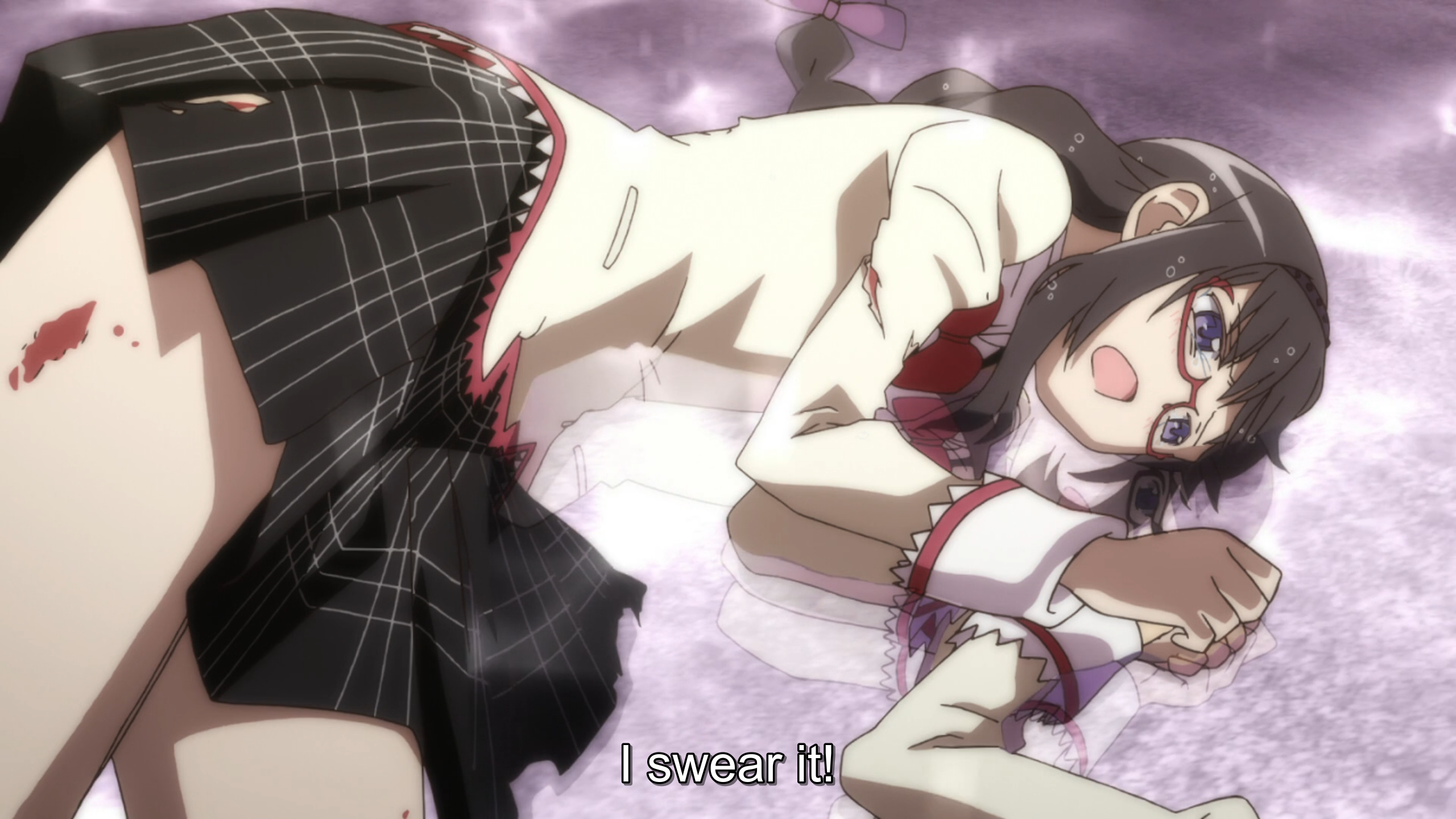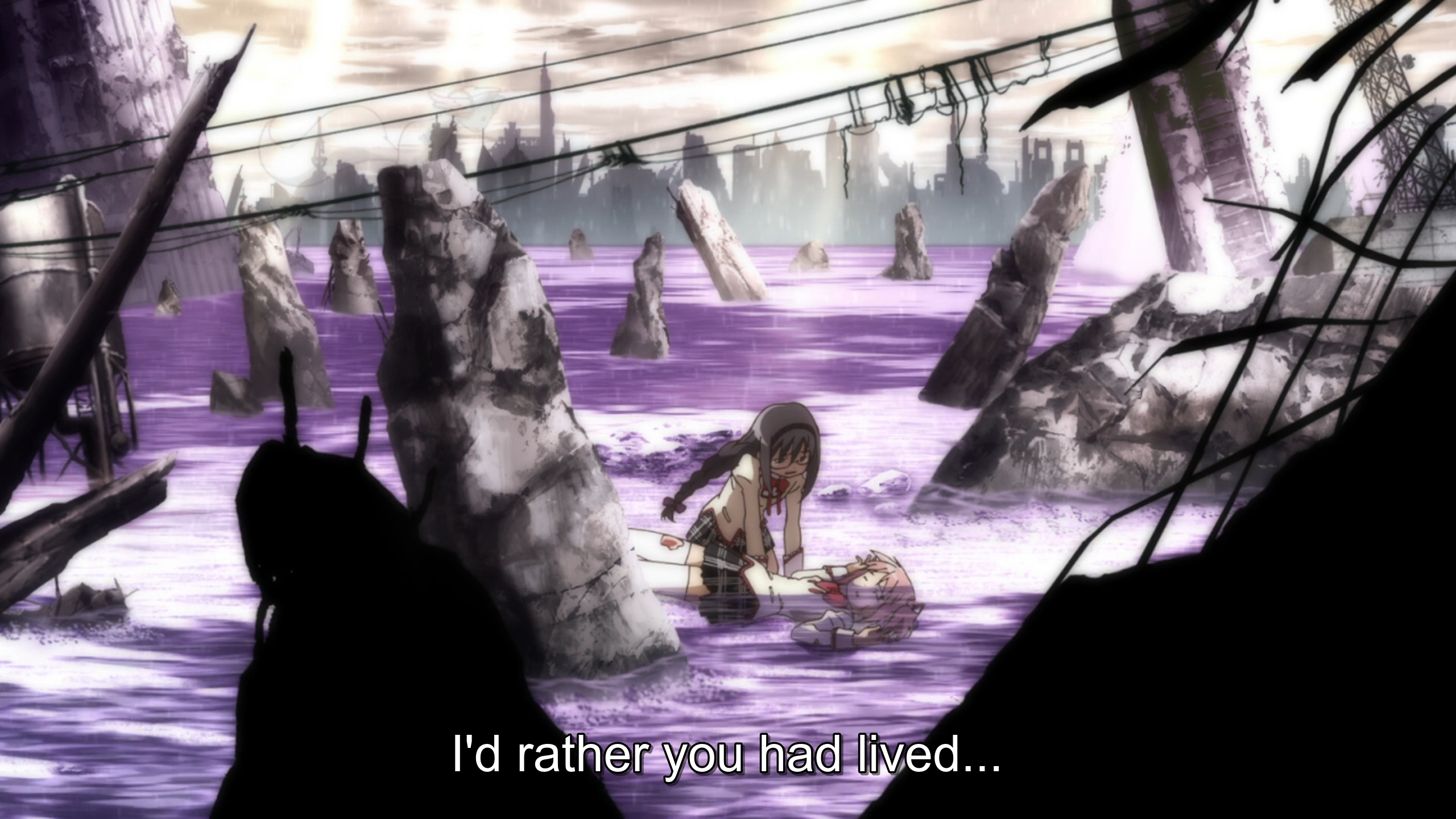 In episode ten, we see that, originally, Homura was a weak and insecure girl in dire need of a savior. Madoka fulfilled that role for her, saving Homura not just from physical harm when she found her cornered in a witch’s labyrinth, but from her insecurity as well, by becoming her true friend. Then, Homura goes on to witness the greatest tragedy she could imagine. Her only friend saves her again, but this time at the cost of her own life. Madoka made this heroic sacrifice gladly, but Homura could not receive it so. It was too bitter a sacrifice to lose her friend.