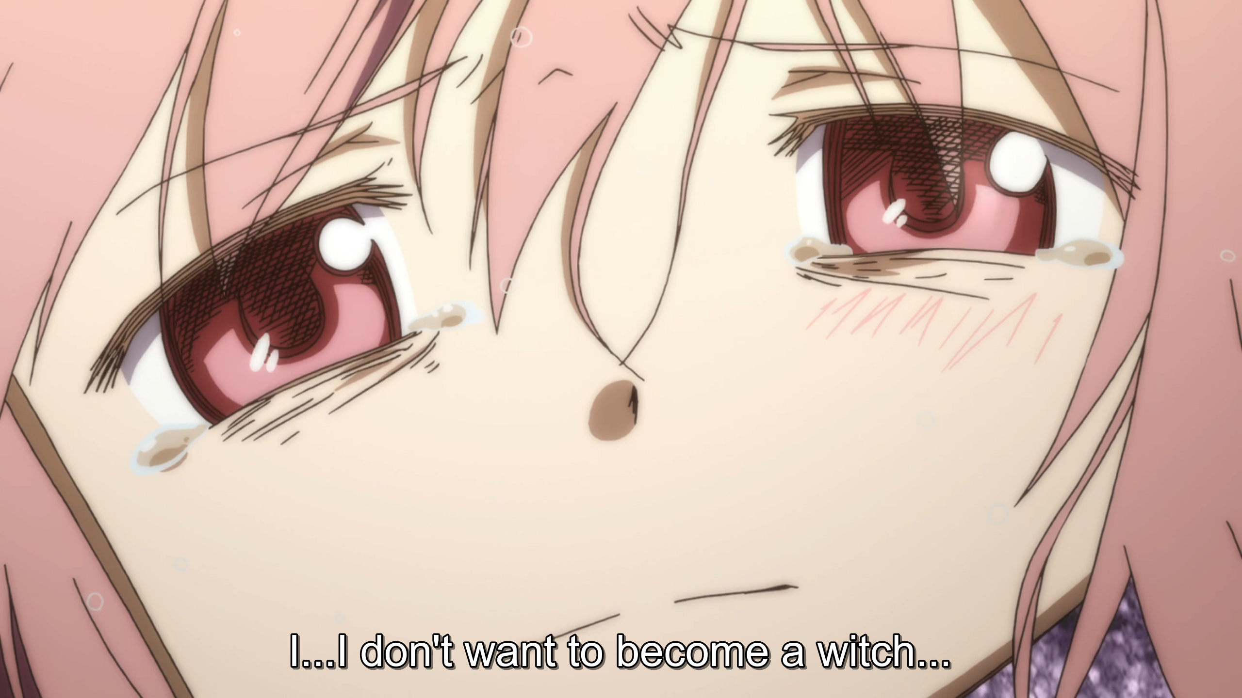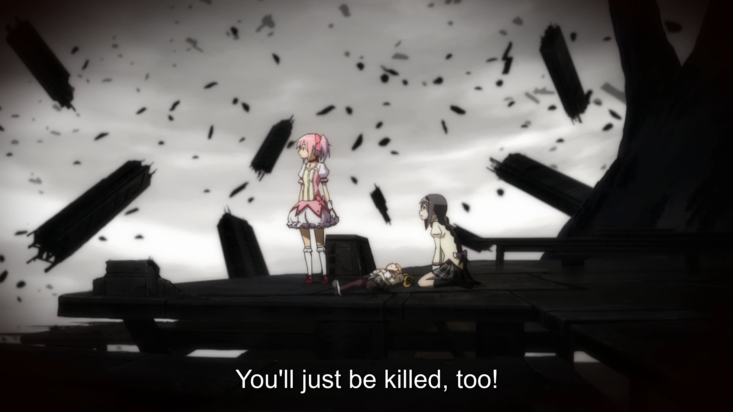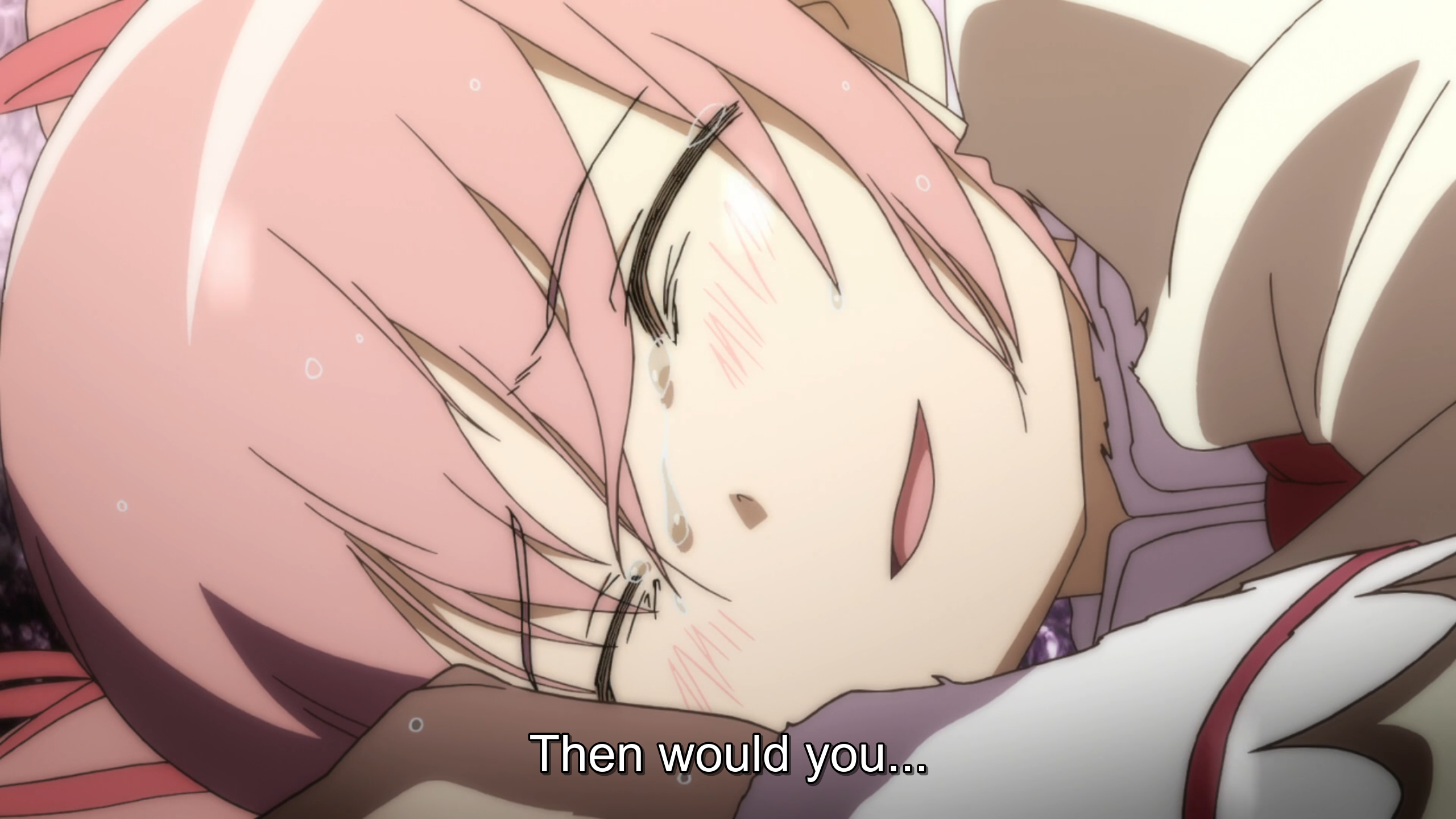 Throughout most of the series, though, the selfish, nihilistic framing of the wishes gets the upper hand, only seeming to grow stronger as the story progresses. The girls are fighting because of their wishes, and on top of that, there is also a psychological battle being waged over the legitimacy of their wishes. Kyubey weaponizes each girl’s wish against herself in a fatalistic zero-sum game until his manipulation leads them to die in battle—or worse, turn into a witch out of despair. In the case of Homura, he does this by characterizing her fight as a self-centered quest to keep creating new timelines until she finds one that pleases her. He concludes that her selfish wish will only cause more suffering for Madoka.