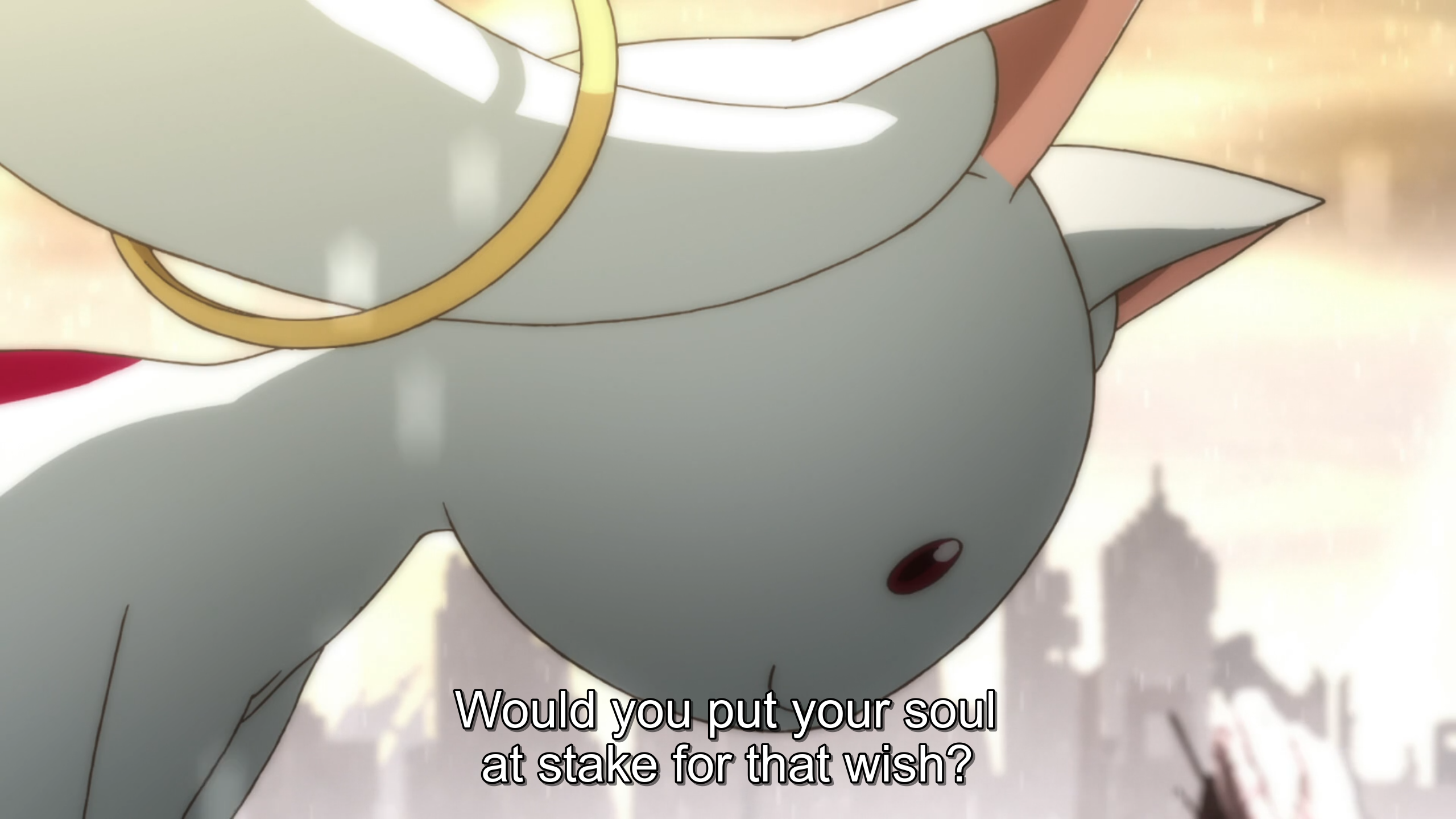 Just as the anime proposes contrasting ways to understand key symbols and characters, there are also two ways to interpret becoming a magical girl: Is this central act truly heroic, or is it actually selfish? Those who argue for the heroic view must deal with the detail that to become a magical girl, you must make a contract with a devilish alien, which involves selling your soul to him in exchange for a wish. But we also can’t deny the sincerity of the wishes. When the girls make their wishes, most don’t ask for something for themselves but instead wish for something that they think will help someone else. The nobility of this is undeniable, to the point that Madoka herself acknowledges Sayaka’s genuine goodwill toward Kyousuke at the end of the series. As if to signal the worthiness of the wishes, they are made not by signing a contract, but with hands clasped together as in prayer, which, again, Madoka explicitly recognizes, referring to all the wishes of magical girls in the past as prayers.