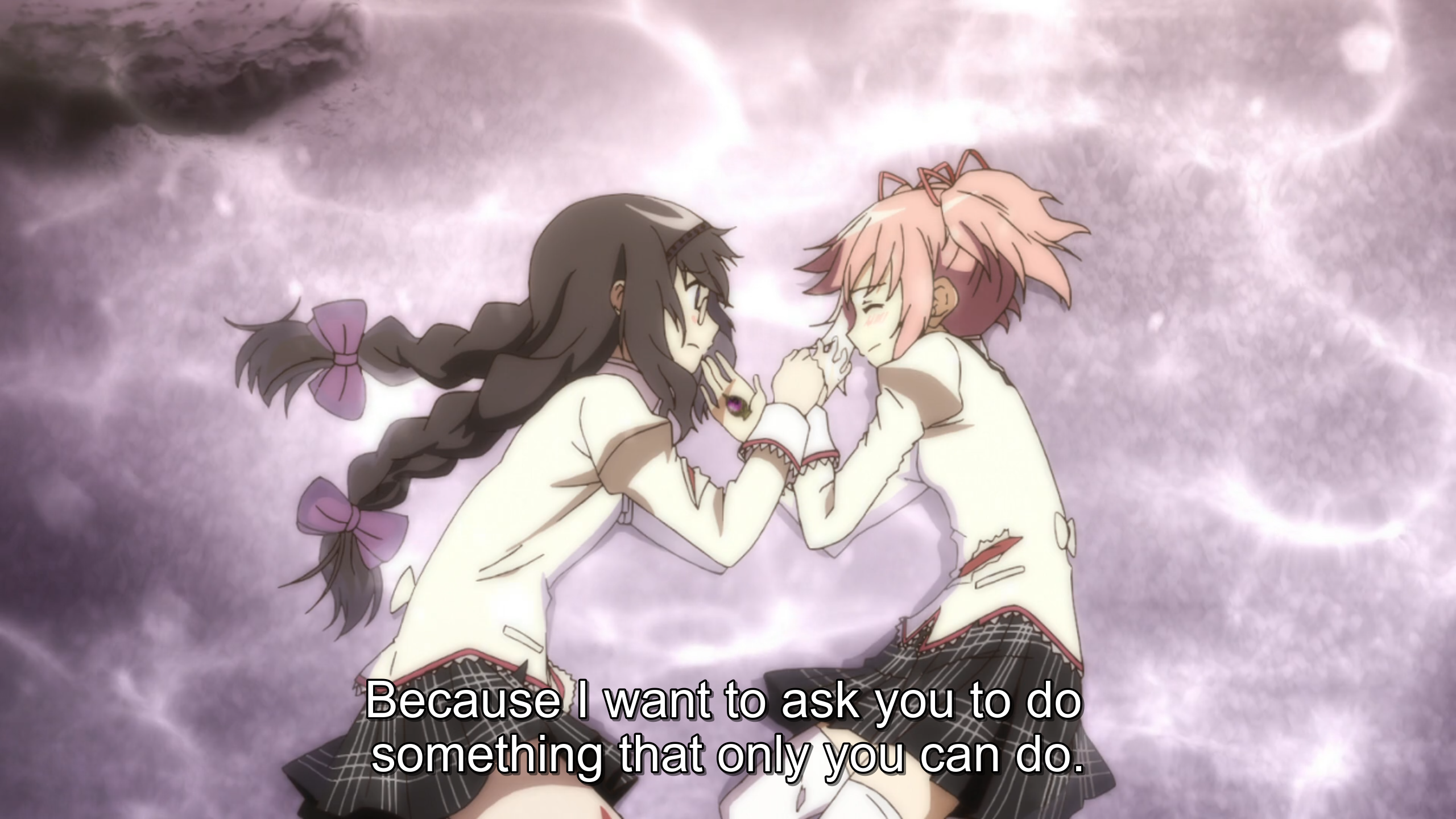 The link between this scene and Madoka’s eventual wish becomes clearer when we take a closer look at Madoka’s request. Apart from being a desperate cry for help, she also displays here an incredible faith in Homura. Her decision to save Homura instead of herself here implies that she truly believes that Homura will succeed in her mission. In all timelines, we see that Madoka doesn’t sacrifice herself lightly, but instead sells her life dearly. This tells us that her hope and trust in Homura are not naive or foolish, so in her confidence, she must have already considered her future wish when she made her request of Homura. In this moment, we see a glimpse of the divine Madoka who emerges at the end of the series. And this is fitting because an ordinary person would have no right to make the kind of request she did. Madoka knew that Homura would accept her request and that a huge amount of suffering would be waiting for Homura as a result. The only way this could be justified is if Madoka had a future in mind where all the suffering would be worth it. Effectively, Madoka’s words echo those of Christ when He said: “If anyone desires to come after Me, let him deny himself, and take up his cross, and follow Me.”
