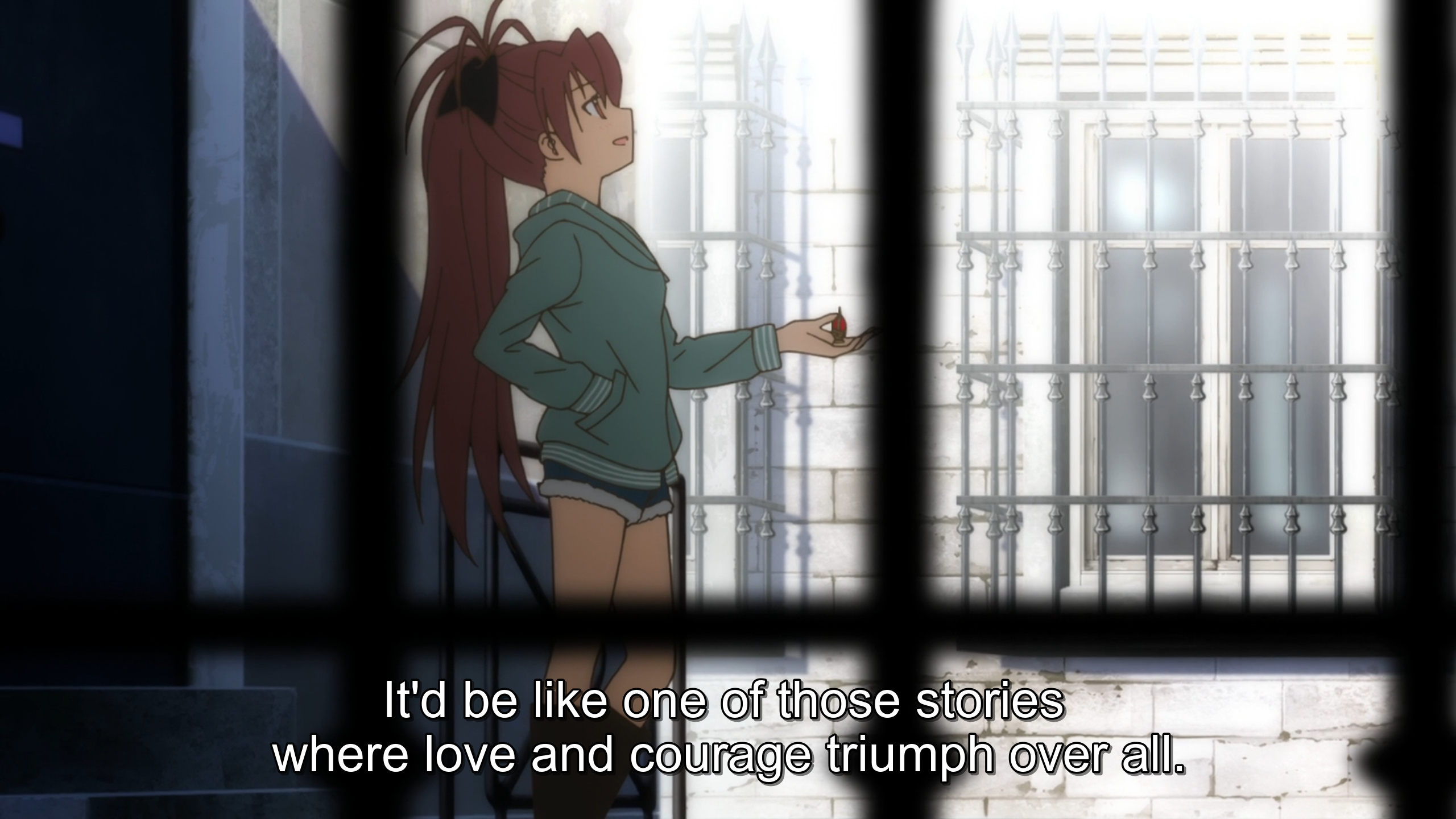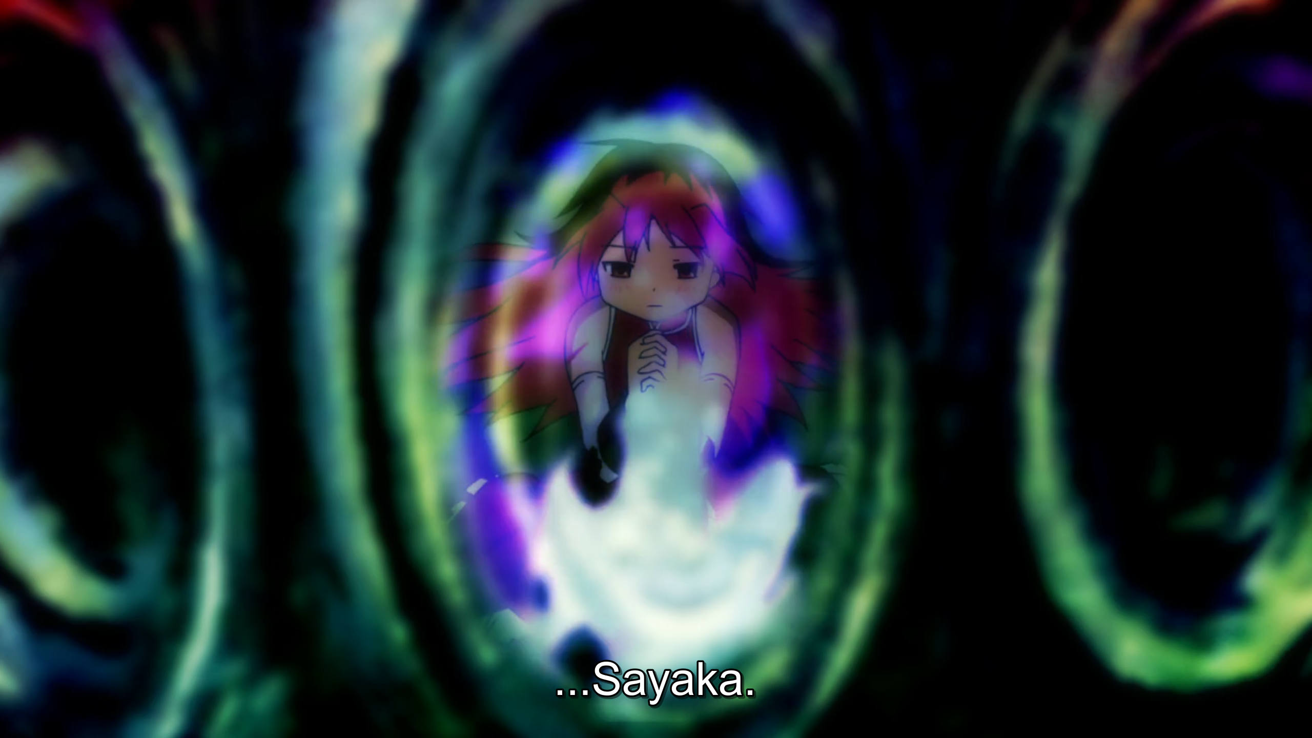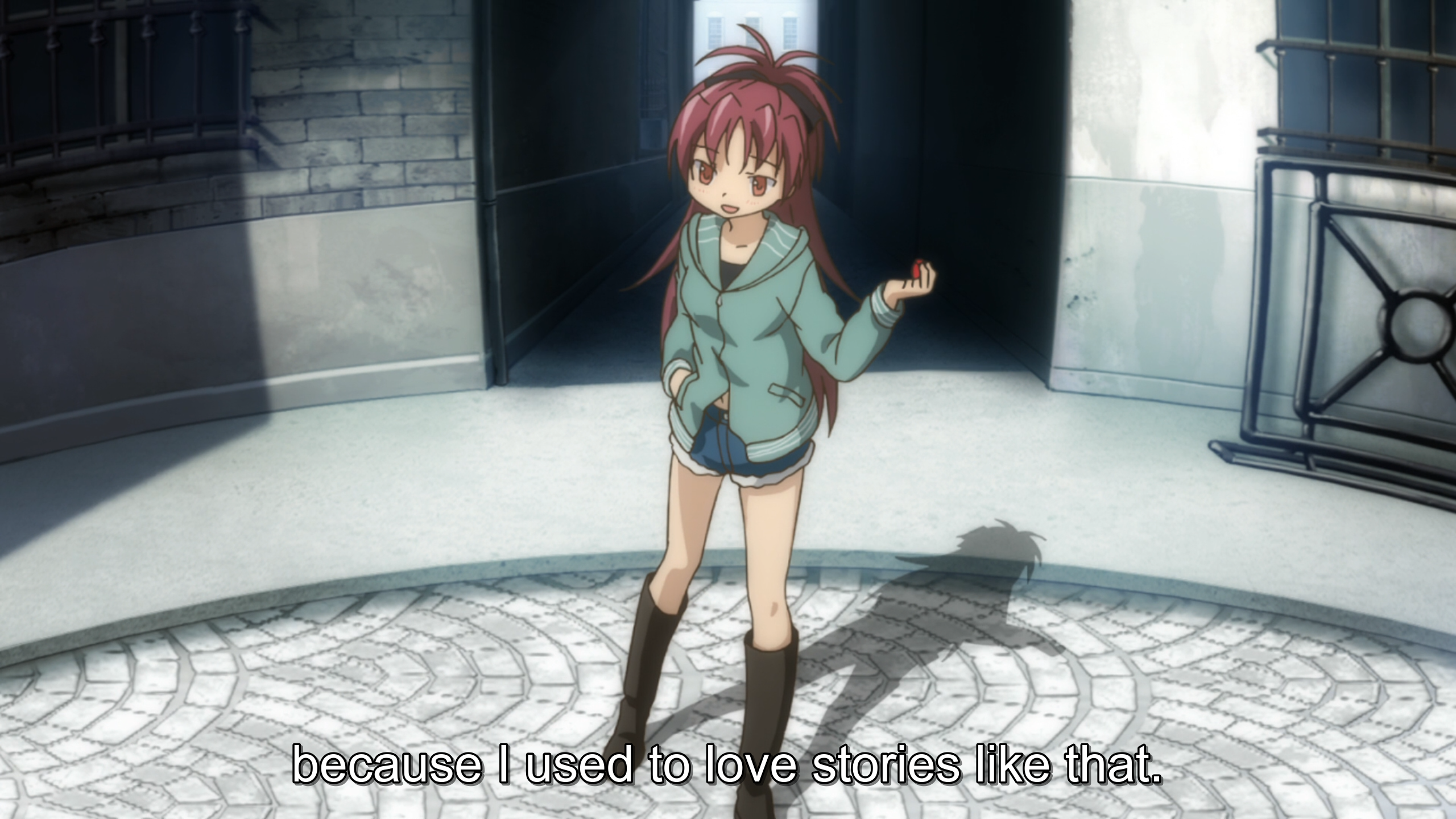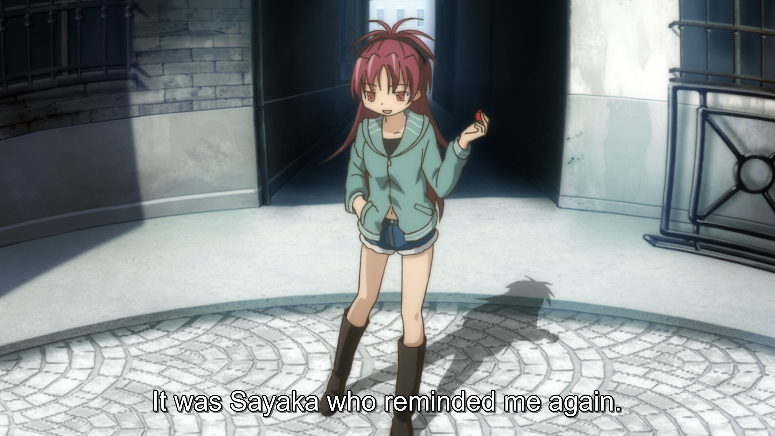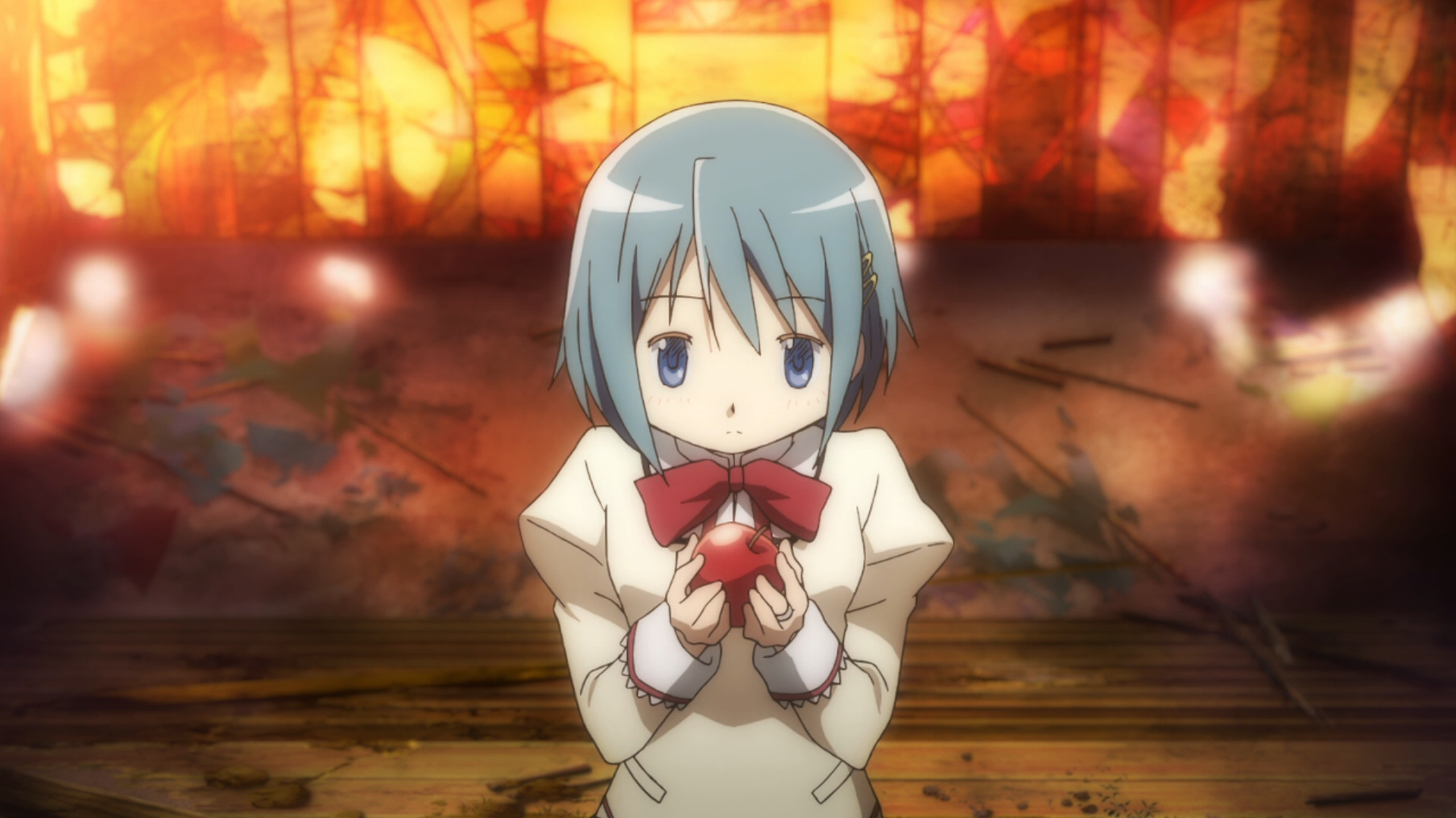 Japanese viewers might have an easier time connecting the dots here because the same sharing of apples happens in Kenji’s classic children’s story, Night on the Galactic Railroad. The two protagonists of this story even share Kyouko and Sayaka’s hair colors. The parallel with this story foreshadows Kyouko’s fate as well: Just like the red-haired (or red-furred?) protagonist in Galactic Railroad, her life will meet a heroic and noble end. Sayaka’s sincerity affects Kyouko, returning her to her pure and hopeful true self. Her naive attempt to save Sayaka ultimately fails, but nevertheless, her final moment is passed in prayer, conveying the hope that things might still be set to rights.