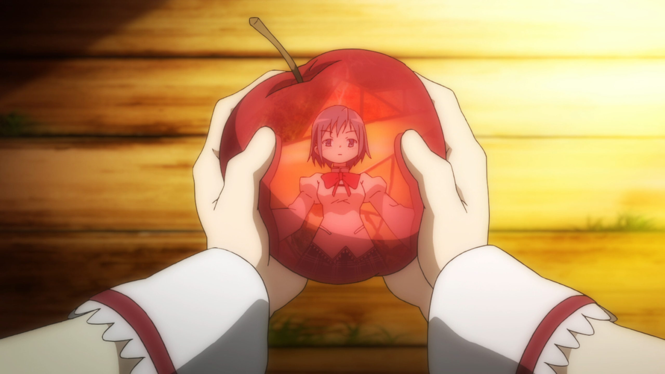 But there’s more going on here. Sayaka’s understanding of the apple is incomplete if not flat-out wrong. She comes to this realization as Kyouko begins pouring her heart out, talking about her past. She tells Sayaka about how her naive hope in being a magical girl led to a painful end for her family, and how she recognizes this same naivety in Sayaka and wants to protect her from the same tragedy. Kyouko, this callous and selfish girl, suddenly becomes vulnerable for someone else’s sake. The reversal in the meaning of the apple here, then, turns it from a sign of sin into a symbol of the power of selfless sharing.