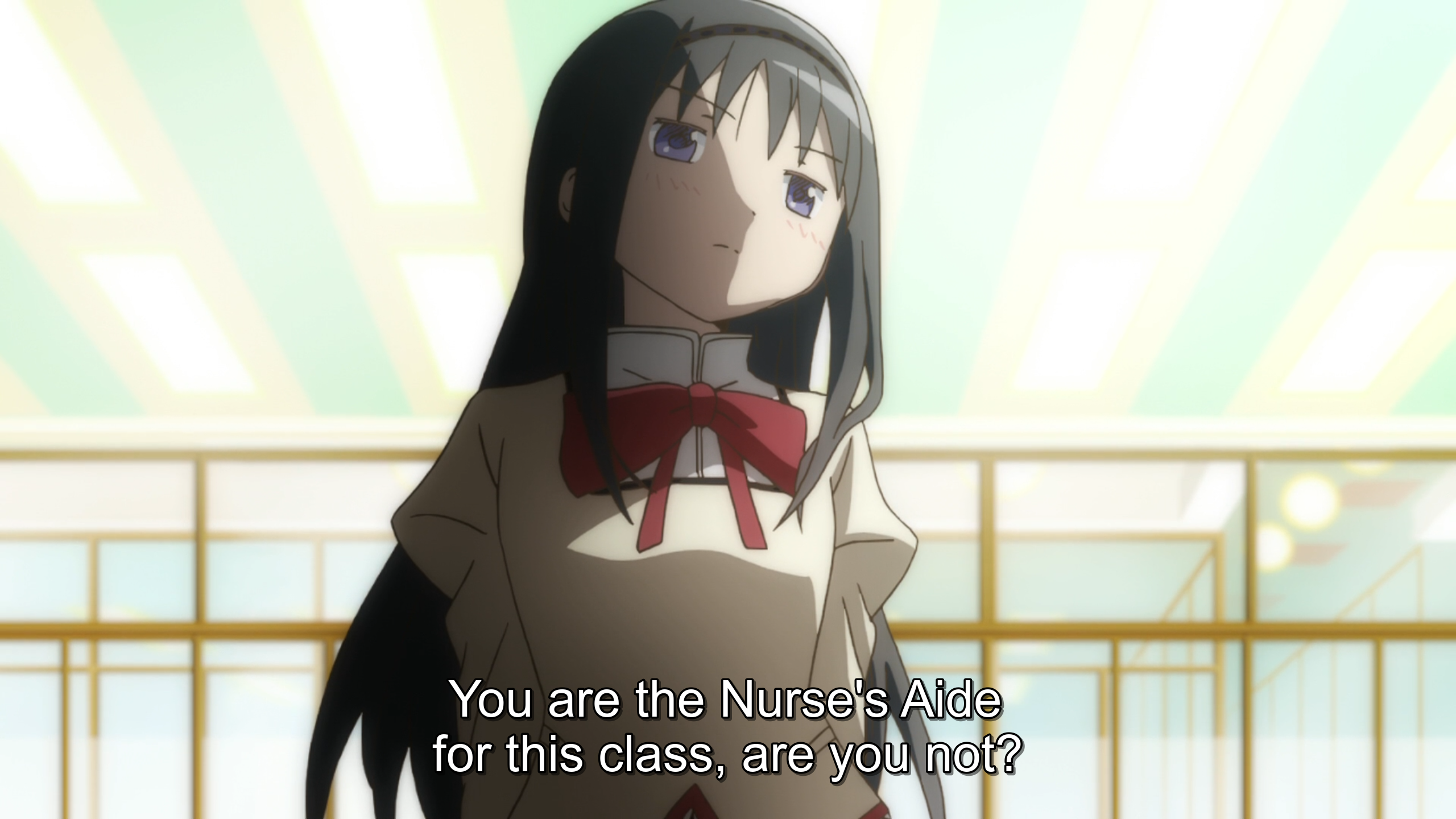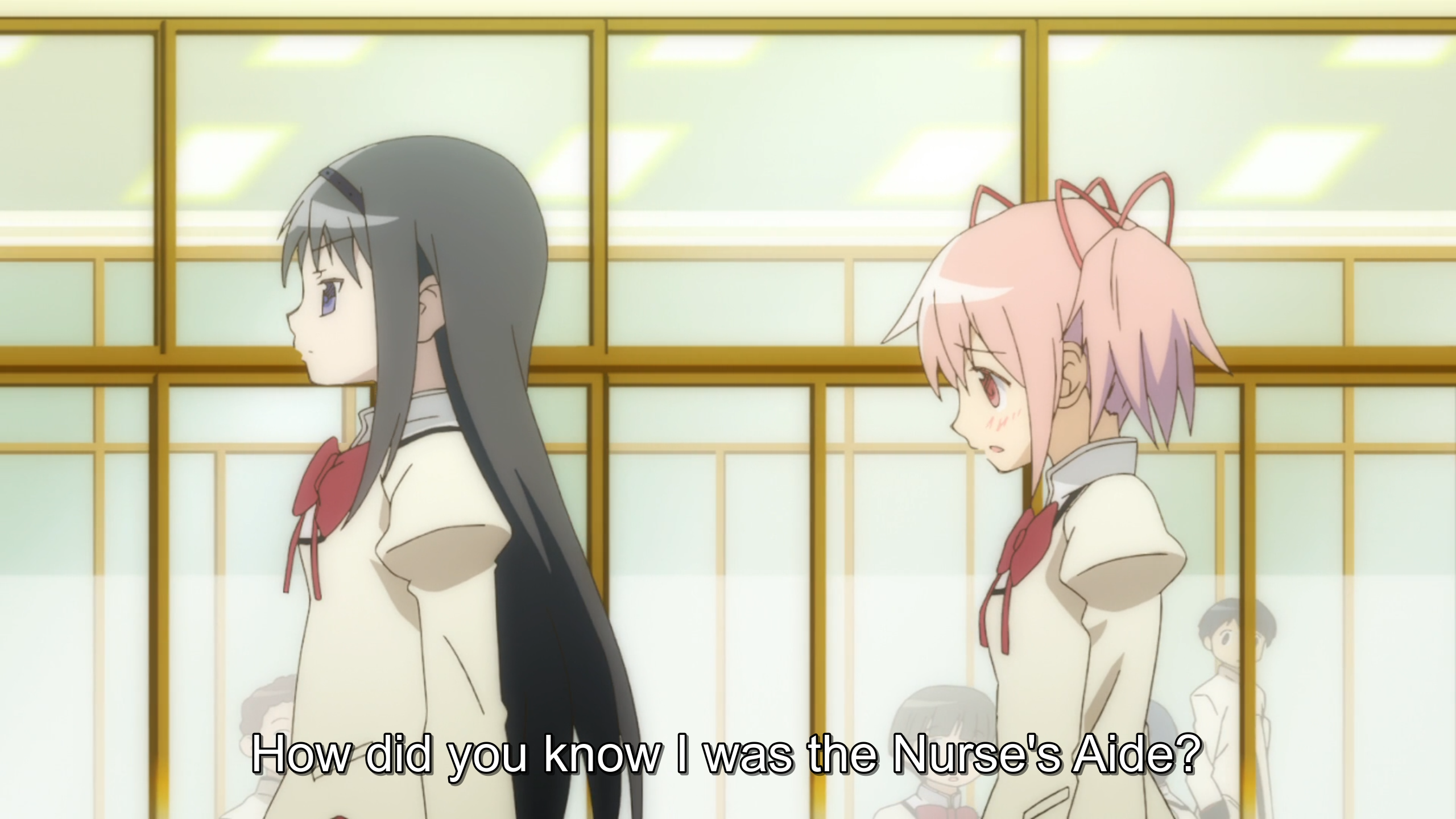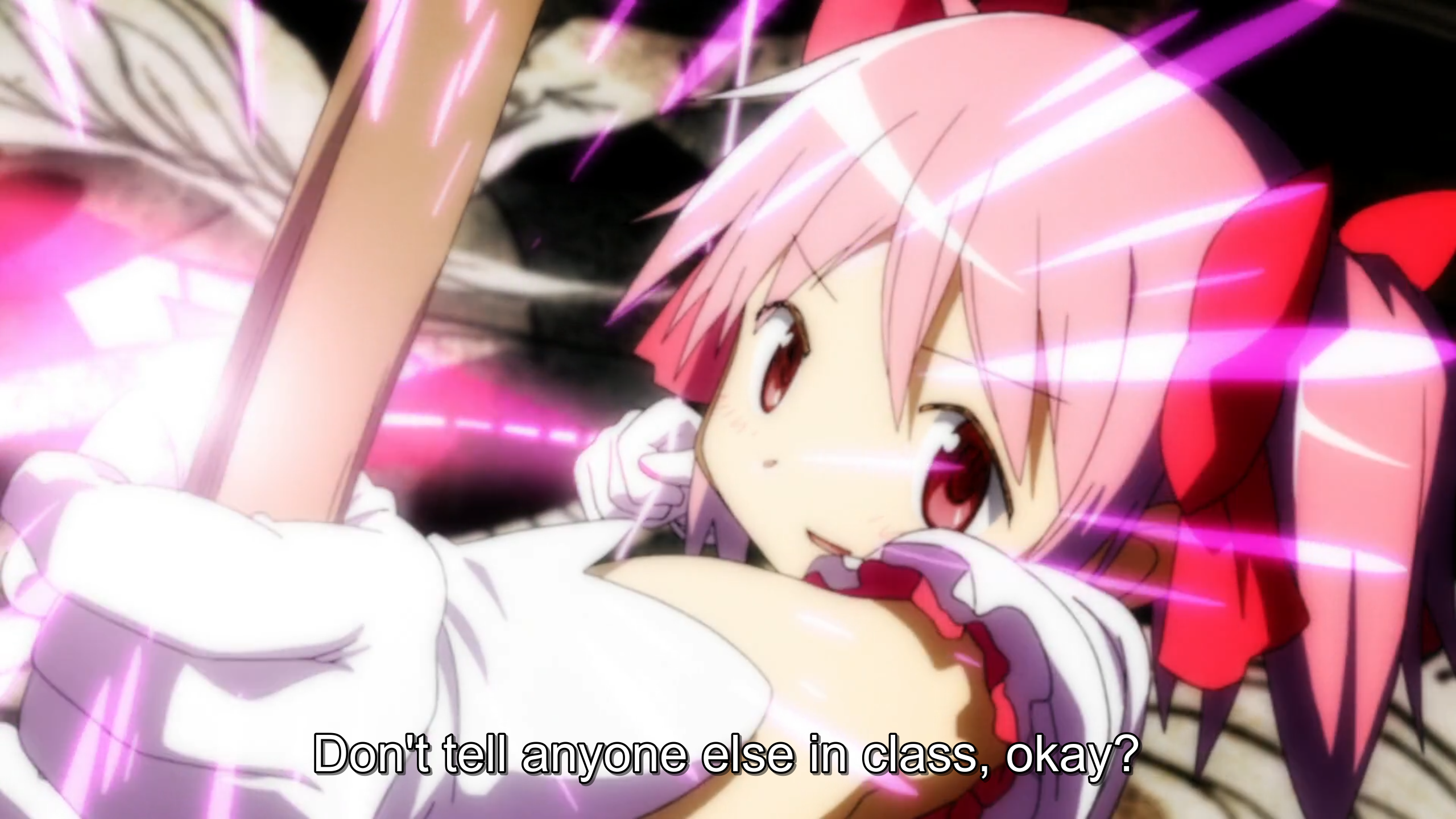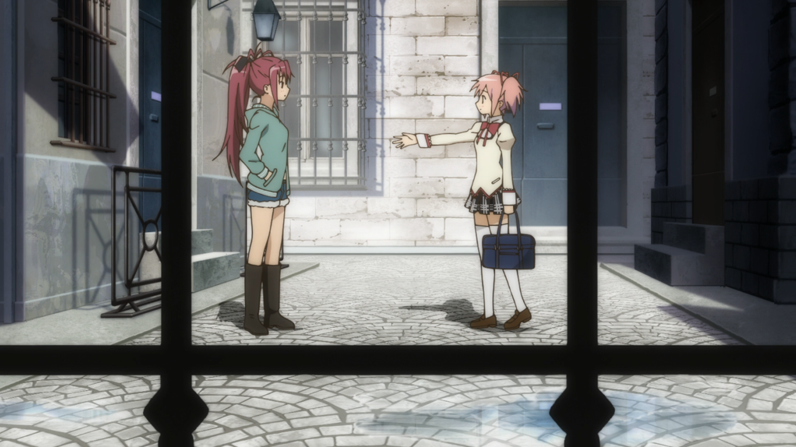 As with the apple, the series gives us an initial impression of Homura that is intentionally misleading. The first episode plays around a lot with this tension in the form of foreshadowing that is recognizable only in retrospect, as Bobduh wrote about. First-time viewers will have a hard time figuring out why Homura knows her way around the school and why she clenches her teeth when Madoka calls her by her first name. Other than being interesting for rewatchers, these little oddities seem to prime the viewer for what is to come later. The same intent is likely behind Homura’s line about having attended a Christian school, which is basically the only thing she reveals of herself to her classmates. This prepares us for the Christian symbolism to follow, which we wouldn’t usually expect in anime.