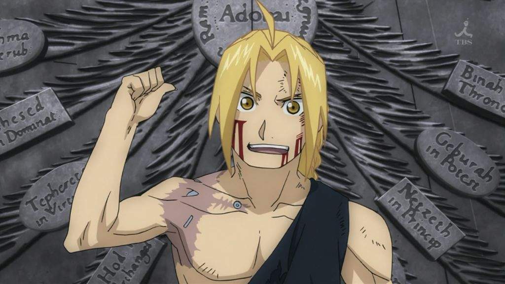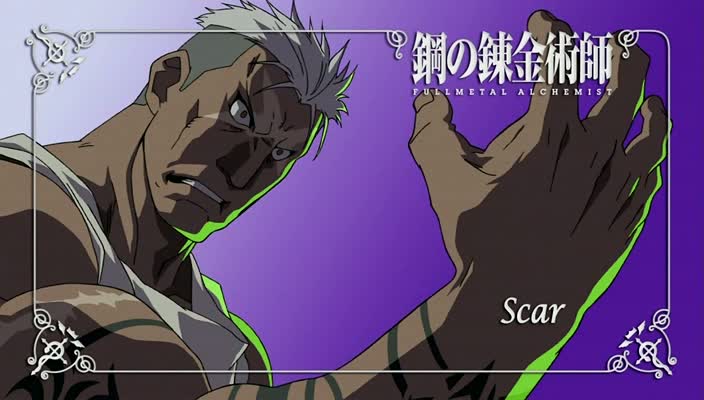 By the end of the story, we have Scar, another religious person, who says he received his name from the god Ishvala, but throughout his journey acts under another name — “Scar” — a symbol of vengeance against the army and alchemy. His journey involves abandoning religion, which is why, at the end of the story, he is confronted by Bradley as someone who has discovered that there is no God, but who did not despair because of it; instead, he continued strengthening his virtues and finally turned his life back toward his community. And then we have the striking line: “I have already died twice; I have no name; call me whatever you like” (it is Scar abandoning both his religious name and his name as an avenger).