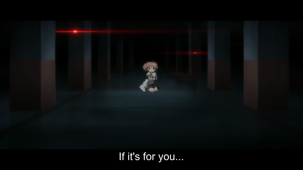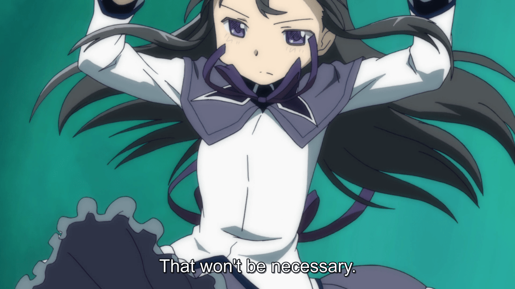 I can’t think of a work of fiction that portrays a greater willingness to endure suffering for someone they love than what we see with Homura. After Homura’s wish is reshaped into a promise to Madoka, she commits to her new mission by giving up an important part of herself: her own self-image. She always saw herself as weak and timid, but in order to honor her promise, a person like that won’t do. As a sweet and sensitive girl, Homura is not fit to be a strong iron-willed protector. But Homura keeps on trying and trying and trying. She won’t let her “soft” personality get in the way of saving the girl she promised to protect.