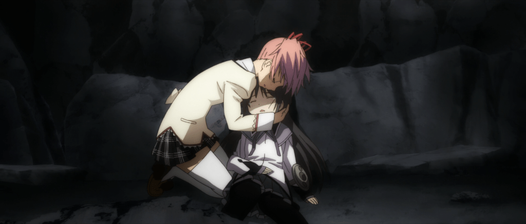 The vulnerability of both of them here makes me think about that moment when Jesus stood in front of the tomb of Lazarus. When he saw how much Mary and her friends were grieving the death of Lazarus, Jesus cried. This powerful God, who would, in the very next moment, resurrect Lazarus, felt a deep compassion when he and his loved ones were faced with loss. His genuine sadness showed the Jews around him that he truly loved Lazarus. Right here, Homura’s vulnerability has a similar effect on Madoka. Homura has been trying to be a savior by being tough and strong, but it is when she weeps that Madoka sees her properly, and perhaps as a friend, for the first time. Homura now finally reveals that she has been bearing all of this just for Madoka. After she regains her composure she repeats her original wish: she insists on being the protector and reassures herself of the nobility of her goal by embracing Madoka, the person who’s worth fighting for. She asks Madoka to trust her because the situation is too crazy to completely explain it to her. As far as possible in her position, Madoka understands and believes Homura.