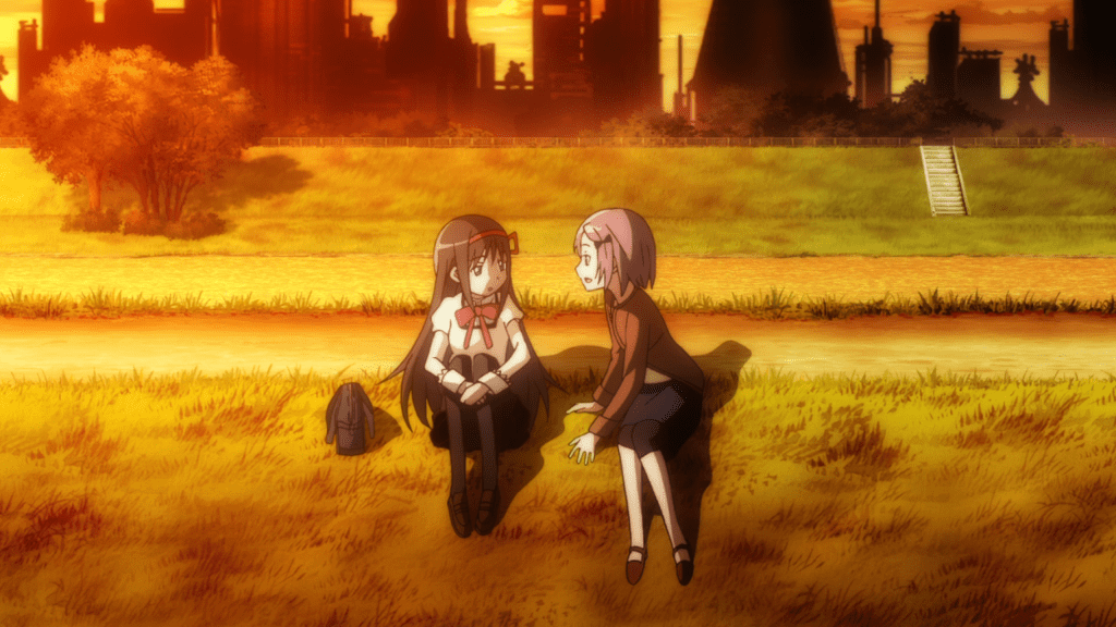 The radical change that Madoka and Homura went through might explain some of the unclarity when rating Madoka as a Christ figure. Sure, if you isolate Madoka as she is in episode 12, she might appear incomplete, because the epilogue shows her mostly in a display of triumphant power. But when we include the whole journey of both girls together in our analysis–their beginnings as imperfect messiahs, their selfless desire to protect each other–and consider how they facilitate each other in the role of savior, we see a fuller picture. We see that salvation did not come before the suffering of the cross: the loyal sacrifice Homura has made across countless timelines has directed and empowered Madoka toward that final victory over death and despair. And Madoka’s transcendent compassion and hope have ignited a belief in a happy future, even in the heart of one who bore as much pain as Homura. The anime leaves us with Homura facing the dark world that she trusts Madoka to redeem in the end.