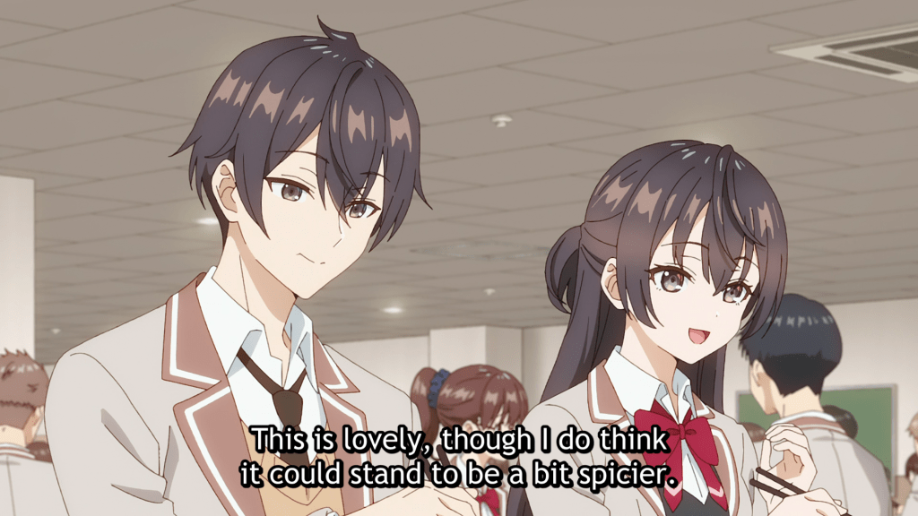Yep, this is going to be about the girls, and there will be harem elements involved, but episode one has so much going for it beyond the standard; so those who despise harem series may find themselves enjoying the anime for its beautiful animation, lovely opening and slightly obnoxious but also very catchy ending, and again, the cute characters. Masachika is pretty standard as a lead, but more on the “I get why the girls like him” side of that type of ordinary protagonist than the “Why do they like this bozo?” end. He’s also more handsome, I would say, than he is in the light novel illustrations. In fact, I felt that the LN could be better as an anime than a written series, and it appears that in the hands of Doga Kobo, it will be. Beware, though, that as demonstrated in the entire last scene of about five minutes, the series isn’t afraid to go down the ecchi route—and future episodes will certainly stretch what’s tenable for many viewers when it comes to romantic relationships and fanservice elements. But if you enjoy ecchi in your anime (or are able to withstand it if the story is right), this is very likely to be your rom-com of the season.